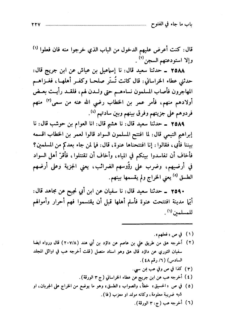 2589- حَدَّثَنَا هُشَيْمٌ ، قَالَ : أَخْبَرَنَا الْعَوَّامُ بْنُ حَوْشَبٍ ، قَالَ : حَدَّثَنَا إِبْرَاهِيمُ التَّيْمِيُّ ، قَالَ : لَمَّا افْتَتَحَ الْمُسْلِمُونَ السَّوَادَ قَالُوا لِعُمَرَ بْنِ الْخَطَّابِ : اقْسِمْهُ بَيْنَنَا فَأَبَى ، فَقَالُوا : إِنَّا افْتَتَحْنَاهَا عَنْوَةً قَالَ : فَمَا لِمَنْ جَاءَ بَعْدَكُمْ مِنَ الْمُسْلِمِينَ ؟ فَأَخَافُ أَنْ تَفَاسَدُوا بَيْنَكُمْ فِي الْمِيَاهِ ، وَأَخَافُ أَنْ تَقْتَتِلُوا فَأَقَرَّ أَهْلَ السَّوَادِ فِي أَرَضِيهِمْ ، وَضَرَبَ عَلَى رُؤُوسِهِمُ الضَّرَائِبَ - يَعْنِي الْجِزْيَةَ - وَعَلَى أَرْضِهِمُ الطَّسْقَ يَعْنِي الْخَرَاجَ ، وَلَمْ يَقْسِمْهَا بَيْنَهُمْ.