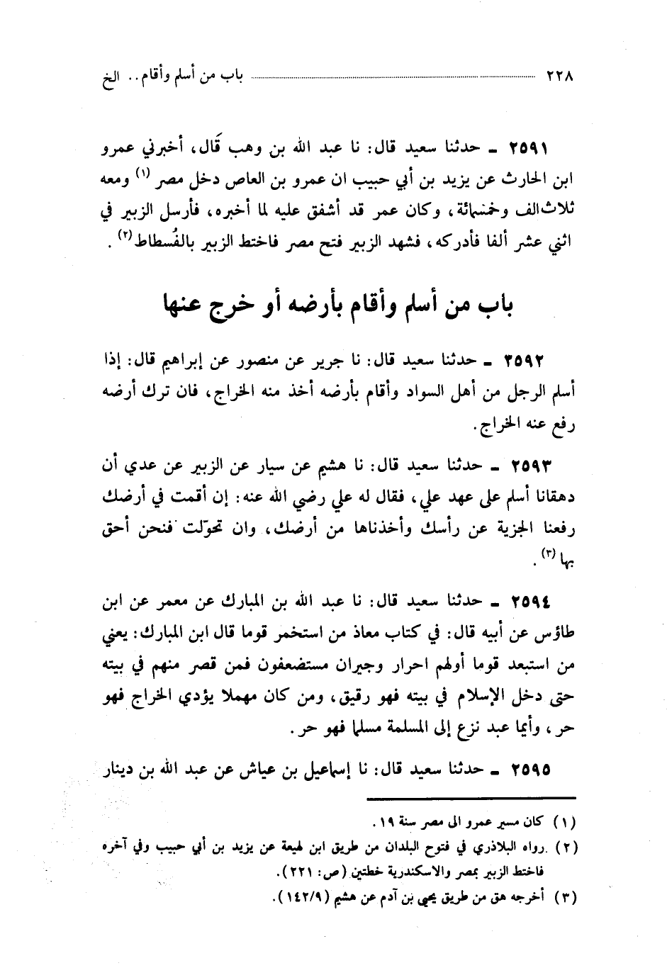2591- حَدَّثَنَا عَبْدُ اللهِ بْنُ وَهْبٍ ، قَالَ ، أَخْبَرَنِي عَمْرُو بْنُ الْحَارِثِ ، عَنْ يَزِيدَ بْنِ أَبِي حَبِيبٍ أَنَّ عَمْرَو بْنَ الْعَاصِ ، دَخَلَ مِصْرَ وَمَعَهُ ثَلاَثَةُ آلفٍ وَخَمْسُمِائَةٍ ، وَكَانَ عُمَرُ قَدْ أَشْفَقَ عَلَيْهِ لَمَّا أَخْبَرَهُ ، فَأَرْسَلَ الزُّبَيْرَ فِي اثْنَيْ عَشَرَ أَلْفًا فَأَدْرَكَهُ ، فَشَهِدَ الزُّبَيْرُ فَتْحَ مِصْرَ ، فَاخْتَطَّ الزُّبَيْرُ بِالْفُسْطَاطِ.