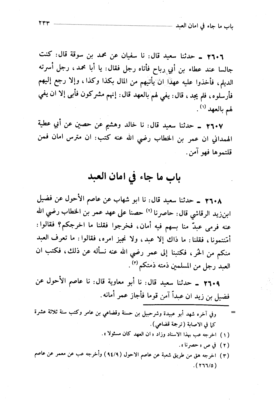 2609- حَدَّثَنَا أَبُو مُعَاوِيَةَ ، قَالَ : حَدَّثَنَا عَاصِمٌ الأَحْوَلُ ، عَنْ فُضَيْلِ بْنِ زَيْدٍ ، أَنَّ عَبْدًا آمَنَ قَوْمًا فَأَجَازَ عُمَرُ أَمَانَهُ.