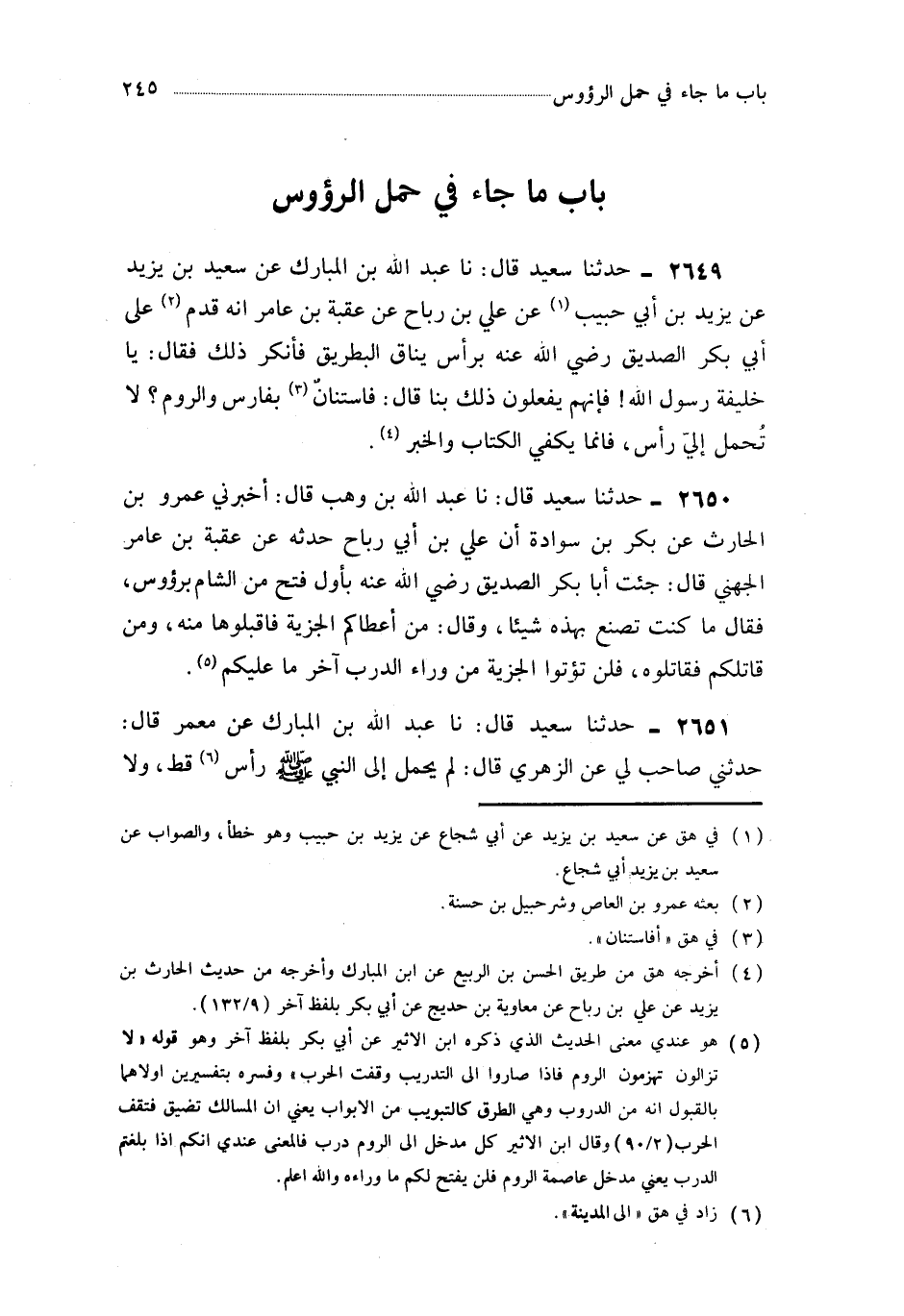 2649- حَدَّثَنَا عَبْدُ اللهِ بْنُ الْمُبَارَكِ ، عَنْ سَعِيدِ بْنِ يَزِيدَ ، عَنْ يَزِيدَ بْنِ أَبِي حَبِيبٍ ، عَنْ عَلِيِّ بْنِ رَبَاحٍ ، عَنْ عُقْبَةَ بْنِ عَامِرٍ ، أَنَّهُ قَدِمَ عَلَى أَبِي بَكْرٍ الصِّدِّيقِ رَضِيَ اللَّهُ عَنْهُ بِرَأْسِ يَنَّاقِ الْبِطْرِيقِ فَأَنْكَرَ ذَلِكَ ، فَقَالَ : يَا خَلِيفَةَ رَسُولِ اللهِ فَإِنَّهُمْ يَفْعَلُونَ ذَلِكَ بِنَا ، قَالَ : فَاسْتِنَانٌ بِفَارِسَ وَالرُّومِ ؟ لاَ تُحْمَلْ إِلَيَّ رَأْسٌ ، فَإِنَّمَا يَكْفِي الْكِتَابُ وَالْخَبَرُ.