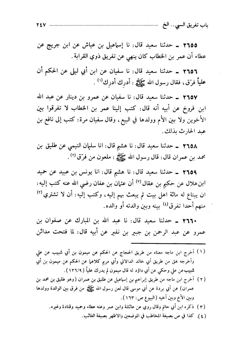 2659- حَدَّثَنَا هُشَيْمٌ ، قَالَ : أَخْبَرَنَا يُونُسُ بْنُ عُبَيْدٍ ، عَنْ حُمَيْدِ بْنِ هِلاَلٍ ، عَنْ حَكِيمِ بْنِ عِقَالٍ ، أَنَّ عُثْمَانَ بْنَ عَفَّانَ ، رَضِيَ اللَّهُ عَنْهُ كَتَبَ إِلَيْهِ : أَنْ يَبْتَاعَ لَهُ مِائَةَ أَهْلِ بَيْتٍ ، ثُمَّ يَبْعَثَ بِهِمْ إِلَيْهِ ، وَكَتَبَ إِلَيْهِ : أَنْ لاَ تَشْتَرِيَ مِنْهُمْ أَحَدًا تُفَرِّقُ بَيْنَهُ وَبَيْنَ وَالِدَتِهِ أَوْ وَالِدِهِ.