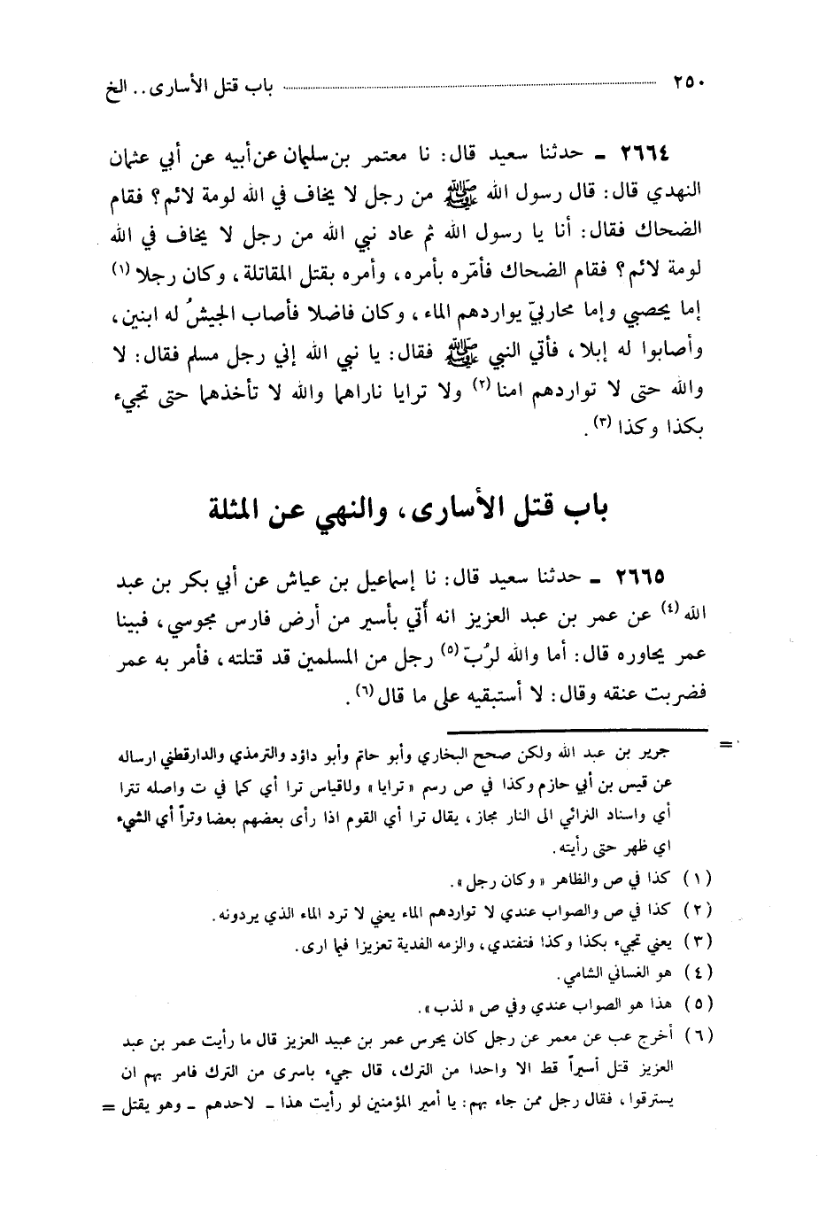 2664- حَدَّثَنَا مُعْتَمِرُ بْنُ سُلَيْمَانَ ، عَنْ أَبِيهِ ، عَنْ أَبِي عُثْمَانَ النَّهْدِيِّ ، قَالَ : قَالَ رَسُولُ اللهِ صَلَّى اللَّهُ عَلَيْهِ وَسَلَّمَ : مَنْ رَجُلٌ لاَ يَخَافُ فِي اللهِ لَوْمَةَ لاَئِمٍ ؟ فَقَامَ الضَّحَّاكُ فَقَالَ : أَنَا يَا رَسُولَ اللهِ ، ثُمَّ عَادَ نَبِيُّ اللهِ : مَنْ رَجُلٌ لاَ يَخَافُ فِي اللهِ لَوْمَةَ لاَئِمٍ ؟ فَقَامَ الضَّحَّاكُ فَأَمَّرَهُ بِأَمْرِهِ ، وَأَمَرَهُ بِقَتْلِ الْمُقَاتِلَةِ ، وَكَانَ رَجُلٌ إِمَّا يَحْصِبِيٌّ ، وَإِمَّا مُحَارِبِيٌّ يُوَارِدُهُمُ الْمَاءَ ، وَكَانَ فَاضِلاً فَأَصَابَ الْجَيْشُ لَهُ ابْنَيْنِ ، وَأَصَابُوا لَهُ إِبِلاً ، فَأَتَى النَّبِيَّ صَلَّى اللَّهُ عَلَيْهِ وَسَلَّمَ فَقَالَ : يَا نَبِيَّ اللهِ إِنِّي رَجُلٌ مُسْلِمٌ ، فَقَالَ : لاَ وَاللَّهِ حَتَّى لاَ تُوَارِدَهُمُ أمنا , وَلاَ تُرَايَا نَارَهُمَا وَاللَّهِ لاَ تَأْخُذْهُمَا حَتَّى تَجِيءَ بِكَذَا وَكَذَا.