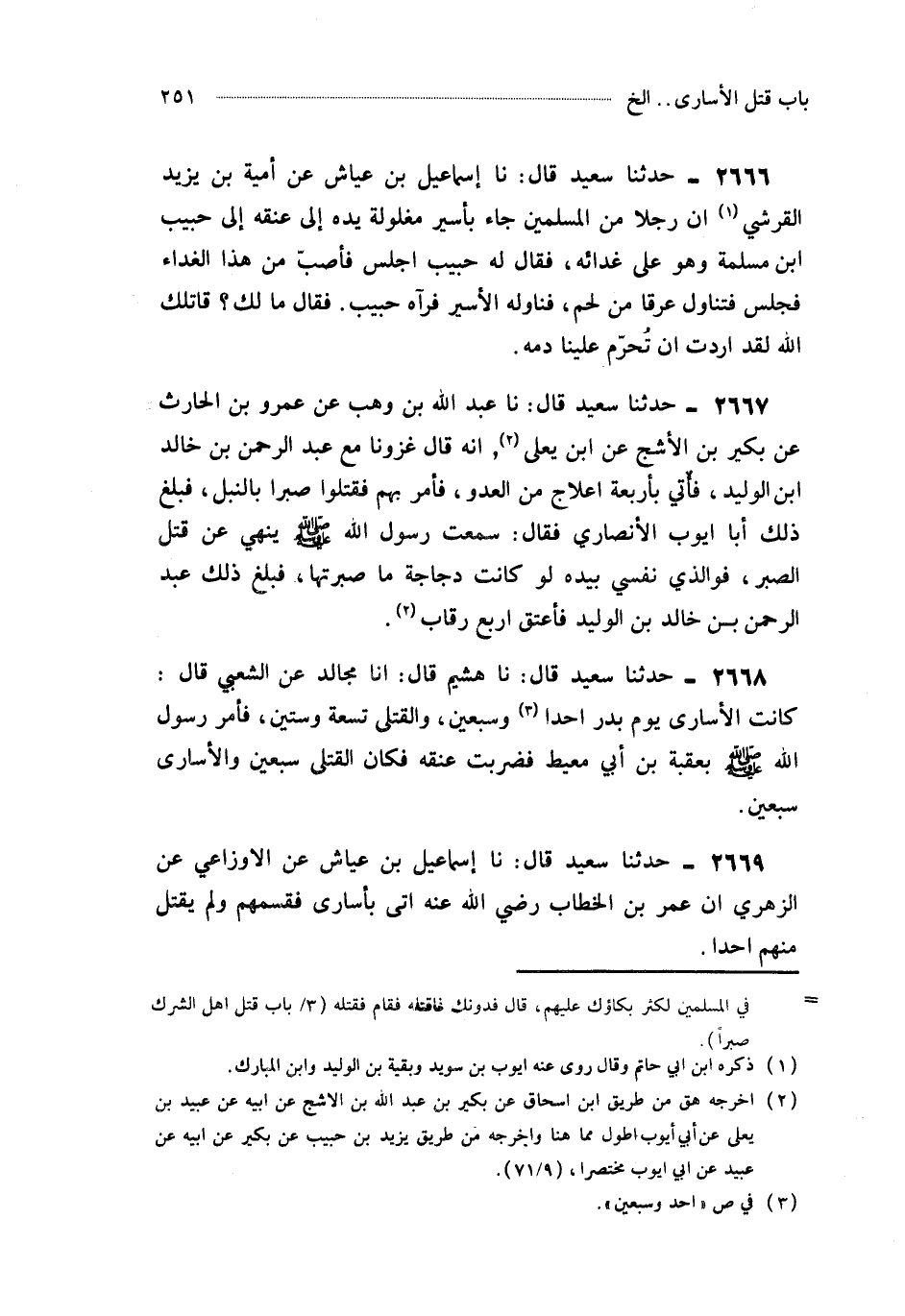 2668- حَدَّثَنَا هُشَيْمٌ ، قَالَ : أَخْبَرَنَا مُجَالِدٌ ، عَنِ الشَّعْبِيِّ ، قَالَ : كَانَتِ الأُسَارَى يَوْمَ بَدْرٍ أَحَدًا وَسَبْعِينَ ، وَالْقَتْلَى تِسْعَةً وَسِتِّينَ ، فَأَمَرَ رَسُولُ اللهِ صَلَّى اللَّهُ عَلَيْهِ وَسَلَّمَ بعُقْبَةَ بْنِ أَبِي مُعَيْطٍ فَضُرِبَتْ عُنُقُهُ ، فَكَانَ الْقَتْلَى سَبْعِينَ وَالأُسَارَى سَبْعِينَ.