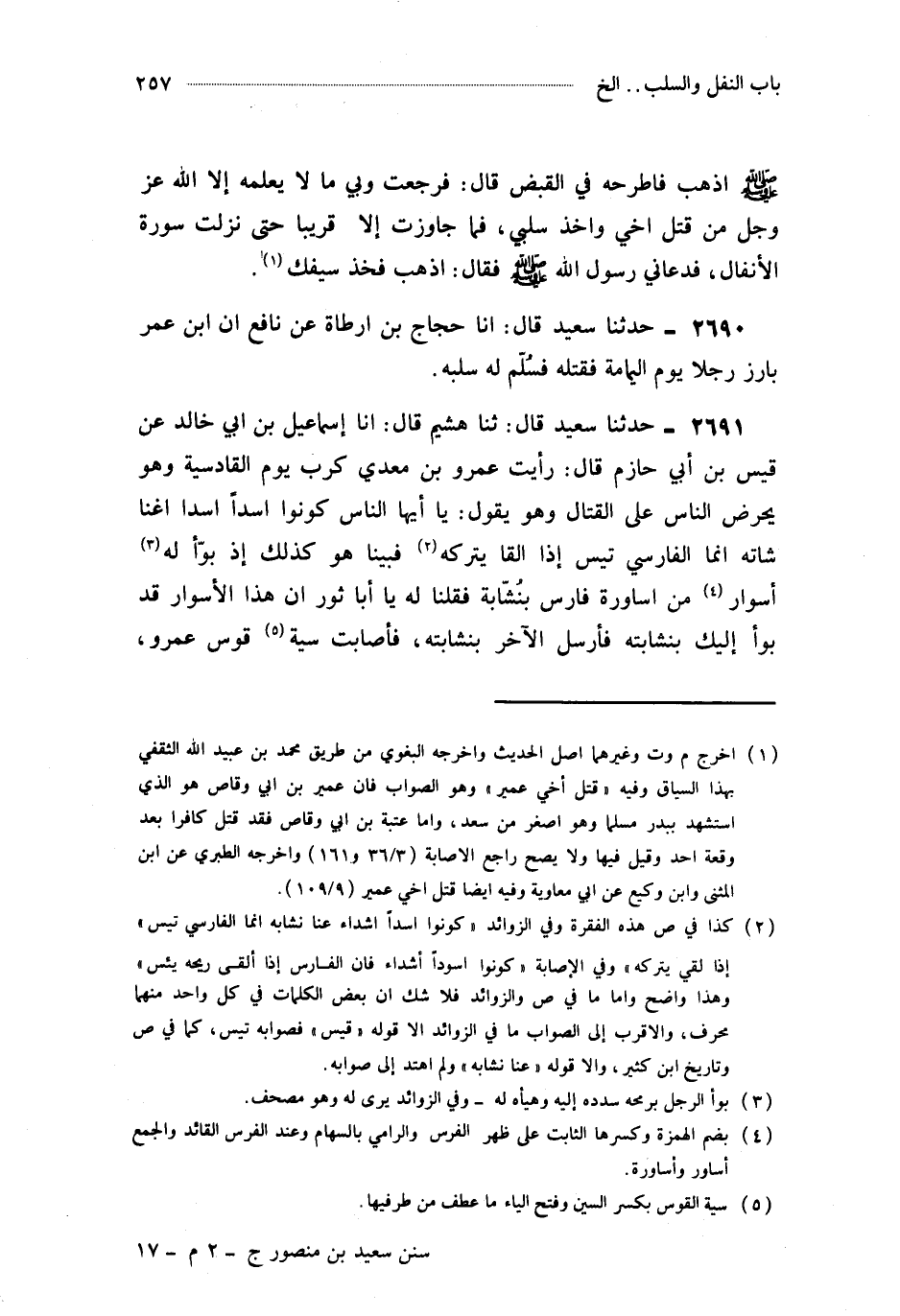 2691- حَدَّثَنَا هُشَيْمٌ ، قَالَ : أَخْبَرَنَا إِسْمَاعِيلُ بْنُ أَبِي خَالِدٍ ، عَنْ قَيْسِ بْنِ أَبِي حَازِمٍ ، قَالَ : رَأَيْتُ عَمْرَو بْنَ مَعْدِي كَرِبَ يَوْمَ الْقَادِسِيَّةِ وَهُوَ يُحَرِّضُ النَّاسَ عَلَى الْقِتَالِ ، وَهُوَ يَقُولُ : يَا أَيُّهَا النَّاسُ كُونُوا أَسَدًا أَسَدًا أَغْنَى شَاتَهُ ، إِنَّمَا الْفَارِسِيُّ تَيْسٌ إِذَا لَقِيَ يَتْرُكُهُ ، فَبَيْنَا هُوَ كَذَلِكَ إِذْ بَوَّأَ لَهُ أَسْوَارٌ مِنْ أَسَاوِرَةِ فَارِسَ بِنُشَّابَةٍ ، فَقُلْنَا لَهُ : يَا أَبَا ثَوْرٍ إِنَّ هَذَا الأَسْوَارَ قَدْ بَوَّأَ إِلَيْكَ بِنُشَّابَتِهِ فَأَرْسَلَ الآخَرُ بِنُشَّابَتِهِ ، فَأَصَابَتْ سِيَةَ قَوْسِ عَمْرٍو ، فَكَسَرَتْهَا ، فَحَمَلَ عَلَيْهِ عَمْرٌو فَطَعَنَهُ ، فَدَقَّ صُلْبَهُ ، فَصَرَعَهُ ، وَنَزَلَ إِلَيْهِ ، فَقَطَعَ يَدَيْهِ ، وَأَخَذَ سِوَارَيْنِ كَانَا عَلَيْهِ وَيَمْلَقًا مِنْ دِيبَاجٍ وَمِنْطَقَةً فَسُلِّمَ ذَلِكَ لَهُ.