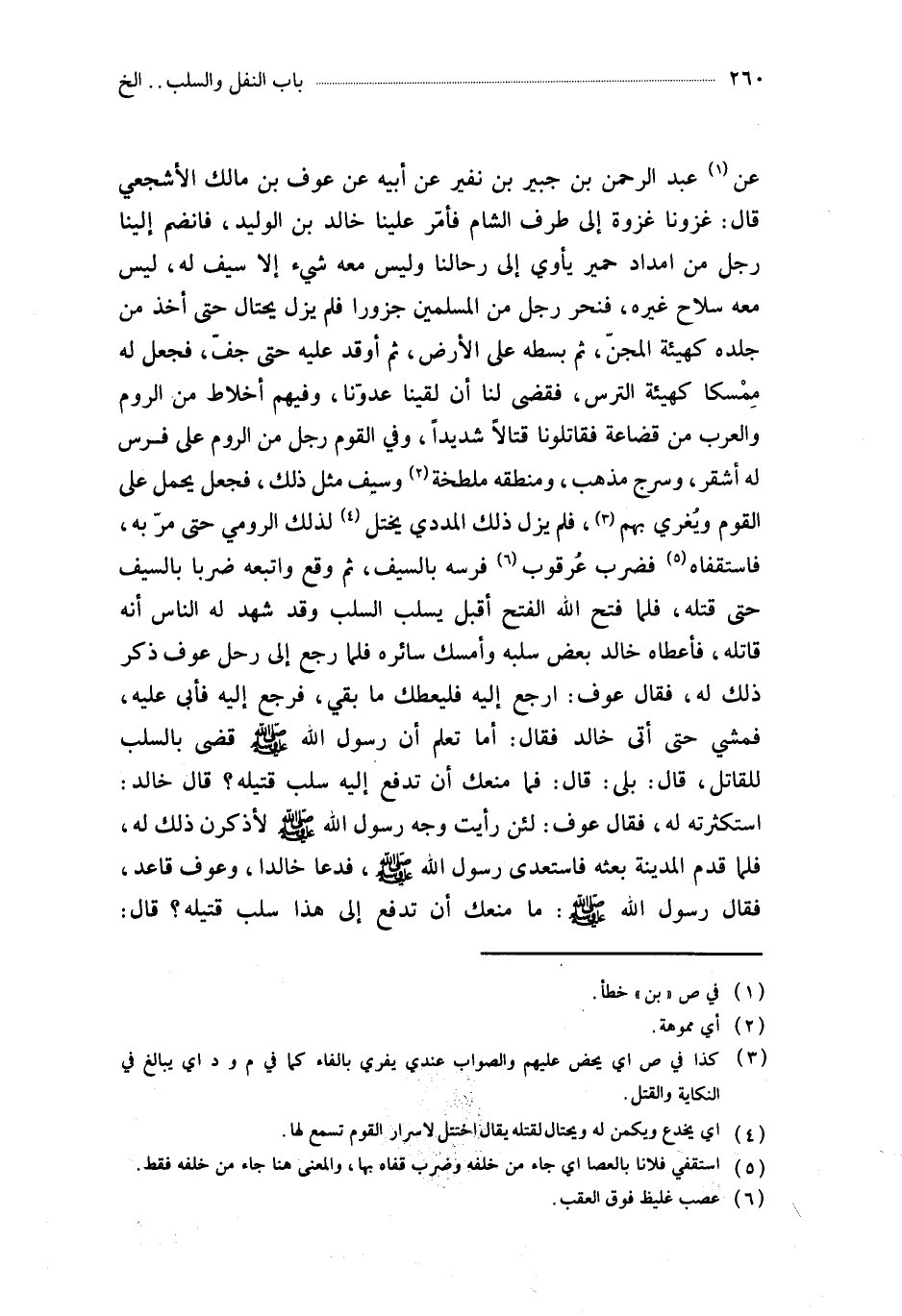 2697- حَدَّثَنَا إِسْمَاعِيلُ بْنُ عَيَّاشٍ ، عَنْ صَفْوَانَ بْنِ عَمْرٍو ، عَنْ عَبْدِ الرَّحْمَنِ بْنِ جُبَيْرِ بْنِ نُفَيْرٍ ، عَنْ أَبِيهِ ، عَنْ عَوْفِ بْنِ مَالِكٍ الأَشْجَعِيِّ ، قَالَ : غَزَوْنَا غَزْوَةً إِلَى طَرَفِ الشَّامِ فَأُمِّرَ عَلَيْنَا خَالِدُ بْنُ الْوَلِيدِ ، فَانْضَمَّ إِلَيْنَا رَجُلٌ مِنْ أَمْدَادِ حِمْيَرَ يَأْوِي إِلَى رِحَالِنَا ، وَلَيْسَ مَعَهُ شَيْءٌ إِلاَّ سَيْفٌ لَهُ ، لَيْسَ مَعَهُ سِلاَحٌ غَيْرُهُ ، فَنَحَرَ رَجُلٌ مِنَ الْمُسْلِمِينَ جَزُورًا فَلَمْ يَزَلْ يَحْتَالُ حَتَّى أَخَذَ مِنْ جِلْدِهِ كَهَيْئَةِ الْمِجَنِّ ، ثُمَّ بَسَطَهُ عَلَى الأَرْضِ ، ثُمَّ أَوَقَدْ عَلَيْهِ حَتَّى جَفَّ ، فَجَعَلَ لَهُ مَمْسَكًا كَهَيْئَةِ التُّرْسِ ، فَقُضِيَ لَنَا أَنْ لَقِينَا عَدُوَّنَا ، وَفِيهِمْ أَخْلاَطٌ مِنَ الرُّومِ ، وَالْعَرَبِ مِنْ قُضَاعَةَ ، فَقَاتَلُونَا قِتَالاً شَدِيدًا ، وَفِي الْقَوْمِ رَجُلٌ مِنَ الرُّومِ عَلَى فَرَسٍ لَهُ أَشْقَرَ ، وَسَرْجٍ مُذَهَّبٍ ، وَمِنْطَقَةٍ مُلَطَّخَةٍ ، وَسَيْفٍ مِثْلِ ذَلِكَ ، فَجَعَلَ يَحْمِلُ عَلَى الْقَوْمِ وَيُغْرِي بِهِمْ ، فَلَمْ يَزَلْ ذَلِكَ الْمَدَدِيُّ يَخْتِلُ لِذَلِكَ الرُّومِيِّ حَتَّى مَرَّ بِهِ ، فَاسْتَقْفَاهُ ، فَضَرَبَ عُرْقُوبَ فَرَسِهِ بِالسَّيْفِ ، ثُمَّ وَقَعَ وَأَتْبَعَهُ ضَرْبًا بِالسَّيْفِ حَتَّى قَتَلَهُ ، فَلَمَّا فَتَحَ اللَّهُ الْفَتْحَ أَقْبَلْ يُسْلِبُ السَّلَبَ ، وَقَدْ شَهِدَ لَهُ النَّاسُ أَنَّهُ قَاتِلُهُ ، فَأَعْطَاهُ خَالِدٌ بَعْضَ سَلَبِهِ ، وَأَمْسَكَ سَائِرَهُ ، فَلَمَّا رَجَعَ إِلَى رَحْلِ عَوْفٍ ، ذَكَرَ ذَلِكَ لَهُ ، فَقَالَ عَوْفٌ : ارْجِعْ إِلَيْهِ فَلْيُعْطِكَ مَا بَقِيَ ، فَرَجَعَ إِلَيْهِ فَأَبَى عَلَيْهِ ، فَمَشَى حَتَّى أَتَى خَالِد فَقَالَ : أَمَا تَعْلَمُ أَنَّ رَسُولَ اللهِ صَلَّى اللَّهُ عَلَيْهِ وَسَلَّمَ قَضَى بِالسَّلَبِ لِلْقَاتِلِ ، قَالَ : بَلَى ، قَالَ : فَمَا مَنَعَكَ أَنْ تَدْفَعَ إِلَيْهِ سَلَبَ قَتِيلِهِ ؟ قَالَ خَالِدٌ : اسْتَكْثَرْتُهُ لَهُ ، فَقَالَ عَوْفٌ : لَئِنْ رَأَيْتُ وَجْهَ رَسُولِ اللهِ صَلَّى اللَّهُ عَلَيْهِ وَسَلَّمَ لأَذْكُرَنَّ ذَلِكَ لَهُ ، فَلَمَّا قَدِمَ الْمَدِينَةَ بَعَثَهُ فَاسْتَعْدَى رَسُولَ اللهِ صَلَّى اللَّهُ عَلَيْهِ وَسَلَّمَ ، فَدَعَا خَالِدًا ، وَعَوْفٌ قَاعِدٌ ، فَقَالَ رَسُولُ اللهِ صَلَّى اللَّهُ عَلَيْهِ وَسَلَّمَ : مَا مَنَعَكَ أَنْ تَدْفَعَ إِلَى هَذَا سَلَبَ قَتِيلِهِ ؟ قَالَ : اسْتَكْثَرْتُهُ يَا رَسُولَ اللهِ ، قَالَ : فَادْفَعْ إِلَيْهِ ، قَالَ : فَمَرَّ بِعَوْفٍ ، فَجَرَّ عَوْفٌ بِرِدَائِهِ ، ثُمَّ قَالَ : قَدْ أَنْجَزْتُ لَكَ مَا ذَكَرْتُ لَكَ مِنْ أَمْرِ رَسُولِ اللهِ صَلَّى اللَّهُ عَلَيْهِ وَسَلَّمَ ، فَسَمِعَهُ رَسُولُ اللهِ صَلَّى اللَّهُ عَلَيْهِ وَسَلَّمَ فَاسْتُغْضِبَ ، فَقَالَ : لاَ تُعْطِهِ يَا خَالِدُ لاَ تُعْطِهِ يَا خَالِدُ هَلْ أَنْتُمْ تَارِكُو لِي أُمَرَائِي ، إِنَّمَا مَثَلُكُمْ كَمَثَلِ رَجُلٍ اسْتُرْعِيَ إِبِلاً وَغَنَمًا ، فَرَعَاهَا ، ثُمَّ تَحَيَّنَ سَقْيَهَا ، فَأَوْرَدَهَا حَوْضَهُ ، فَشَرَعَتْ فِيهِ فَشَرِبَتْ صَفْوَهُ ، وَتَرَكَتْ كَدَرَهُ ، فَصَفْوُهُ أَمْرُهُ لَكُمْ ، وَكَدَرُهُ عَلَيْهِمْ.