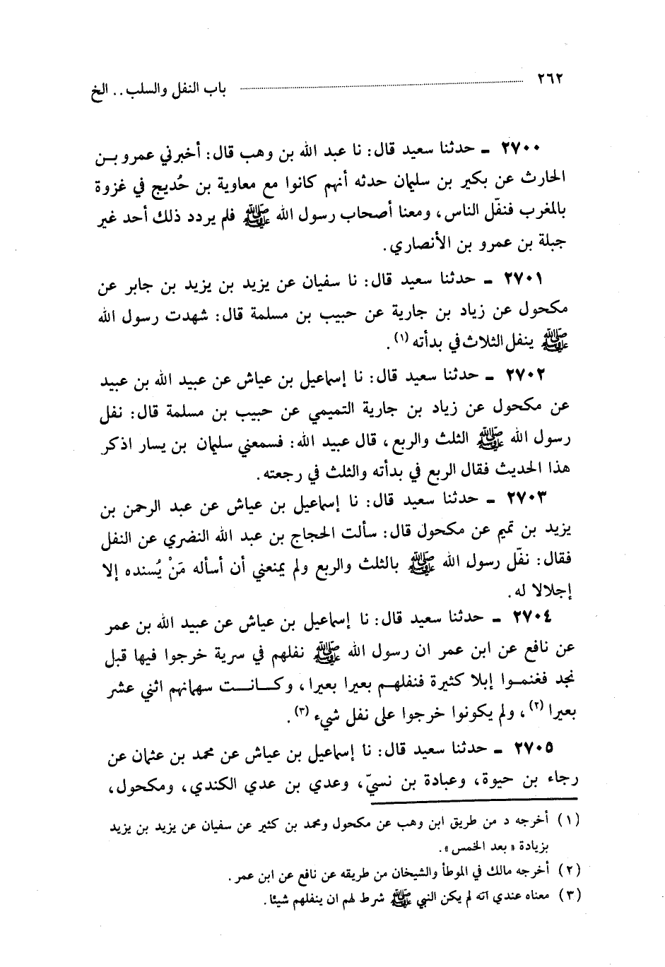 2703- حَدَّثَنَا إِسْمَاعِيلُ بْنُ عَيَّاشٍ ، عَنْ عَبْدِ الرَّحْمَنِ بْنِ يَزِيدَ بْنِ تَمِيمٍ ، عَنْ مَكْحُولٍ ، قَالَ : سَأَلْتُ الْحَجَّاجَ بْنَ عَبْدِ اللهِ النَّضْرِيَّ عَنِ النَّفْلِ ، فَقَالَ : نَفَّلَ رَسُولُ اللهِ صَلَّى اللَّهُ عَلَيْهِ وَسَلَّمَ بِالثُّلُثِ وَالرُّبُعِ وَلَمْ يَمْنَعْنِي أَنْ أَسْأَلَهُ مَنْ يُسْنِدُهُ إِلاَّ إِجْلاَلاً لَهُ.