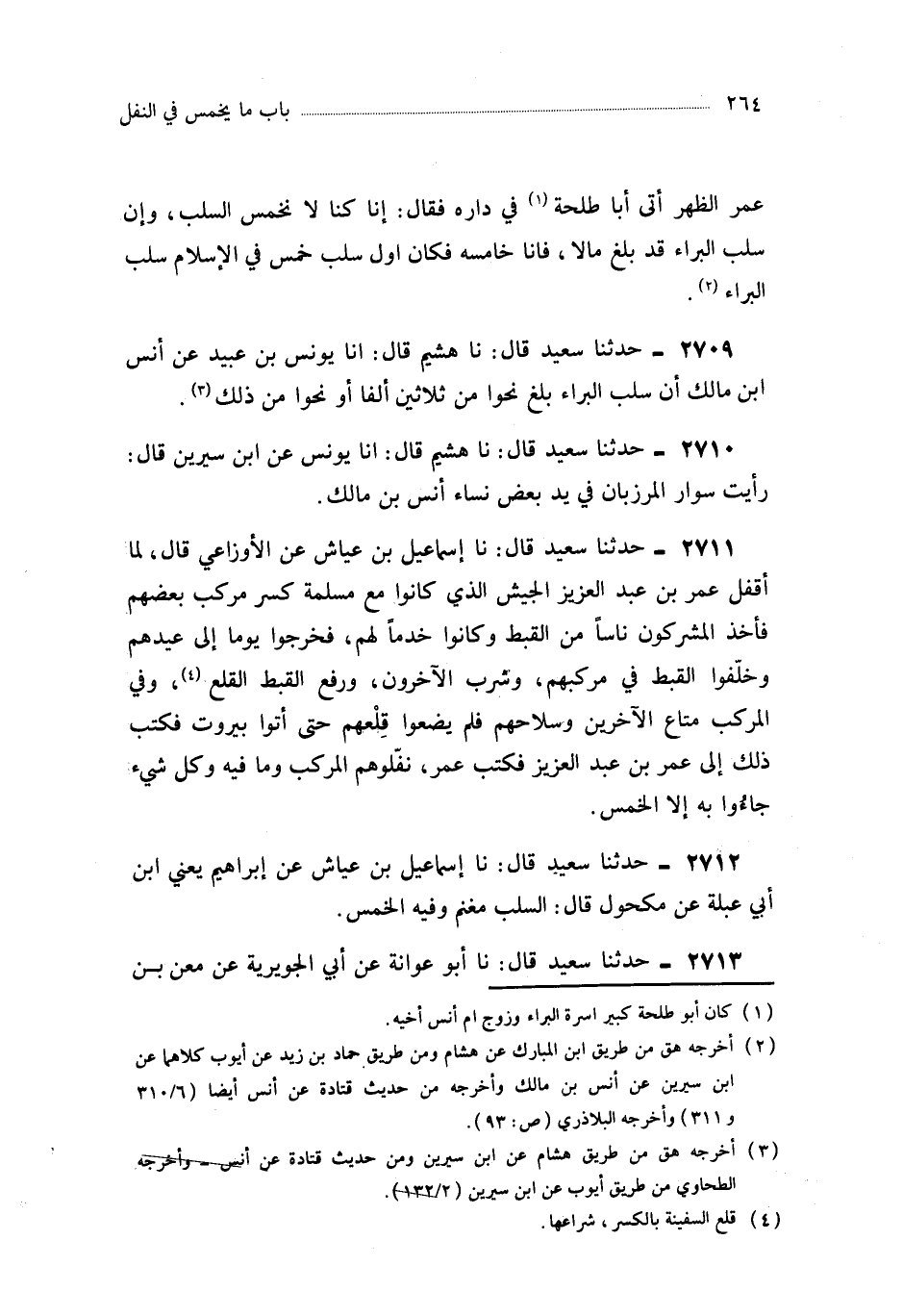 2711- حَدَّثَنَا إِسْمَاعِيلُ بْنُ عَيَّاشٍ ، عَنِ الأَوْزَاعِيِّ ، قَالَ : لَمَّا أَقْفَلَ عُمَرُ بْنُ عَبْدِ الْعَزِيزِ الْجَيْشَ الَّذِي كَانُوا مَعَ مَسْلَمَةَ كُسِرَ مَرْكَبُ بَعْضِهِمْ فَأَخَذَ الْمُشْرِكُونَ نَاسًا مِنَ الْقِبْطِ ، وَكَانُوا خَدَمًا لَهُمْ ، فَخَرَجُوا يَوْمًا إِلَى عِيدِهِمْ ، وَخَلَّفُوا الْقِبْطَ فِي مَرْكَبِهِمْ ، وَشَرِبَ الآخَرُونَ ، وَرَفَعَ الْقِبْطُ الْقِلْعَ ، وَفِي الْمَرْكَبِ مَتَاعُ الآخَرِينَ وَسِلاَحُهُمْ فَلَمْ يَضَعُوا قِلْعَهُمْ حَتَّى أَتَوْا بَيْرُوتَ ، فَكَتَبَ ذَلِكَ إِلَى عُمَرَ بْنِ عَبْدِ الْعَزِيزِ ، فَكَتَبَ عُمَرُ : نَفِّلُوهُمُ الْمَرْكَبَ ، وَمَا فِيهِ وَكُلَّ شَيْءٍ جَاؤُوا بِهِ إِلاَّ الْخُمُسَ.