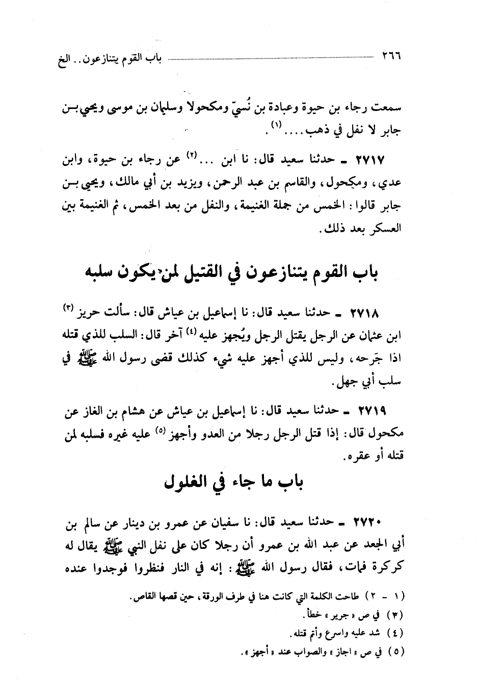 2717- حَدَّثَنَا ابْنُ ... . ، عَنْ رَجَاءِ بْنِ حَيْوَةَ ، وَابْنِ عَدِيٍّ ، وَمَكْحُولٍ ، وَالْقَاسِمِ بْنِ عَبْدِ الرَّحْمَنِ ، وَيَزِيدَ بْنِ أَبِي مَالِكٍ ، وَيَحْيَى بْنِ جَابِرٍ قَالُوا : الْخُمُسُ مِنْ جُمْلَةِ الْغَنِيمَةِ ، وَالنَّفْلُ مِنْ بَعْدِ الْخُمُسِ ، ثُمَّ الْغَنِيمَةُ بَيْنَ الْعَسْكَرِ بَعْدَ ذَلِكَ.