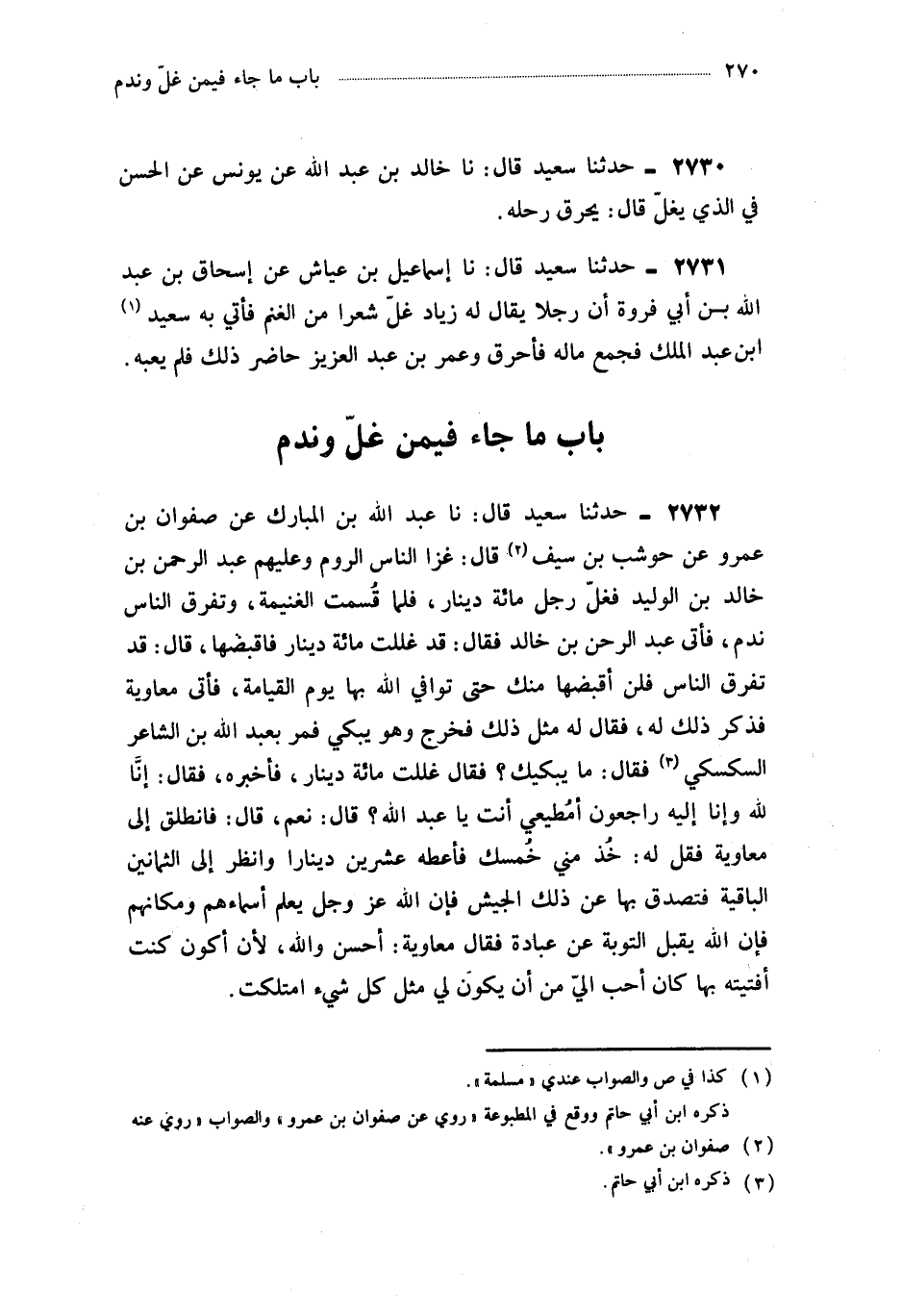 2732- حَدَّثَنَا عَبْدُ اللهِ بْنُ الْمُبَارَكِ ، عَنْ صَفْوَانَ بْنِ عَمْرٍو ، عَنْ حَوْشَبِ بْنِ سَيْفٍ ، قَالَ : غَزَا النَّاسُ الرُّومَ وَعَلَيْهِمْ عَبْدُ الرَّحْمَنِ بْنُ خَالِدِ بْنِ الْوَلِيدِ ، فَغَلَّ رَجُلٌ مِائَةَ دِينَارٍ ، فَلَمَّا قُسِمَتِ الْغَنِيمَةُ ، وَتَفَرَّقَ النَّاسُ نَدِمَ ، فَأَتَى عَبْدَ الرَّحْمَنِ بْنَ خَالِدٍ ، فَقَالَ : قَدْ غَلَلْتُ مِائَةَ دِينَارٍ فَاقْبِضْهَا , قَالَ : قَدْ تَفَرَّقَ النَّاسُ ، فَلَنْ أقْبِضَهَا مِنْكَ حَتَّى تُوَافِيَ اللَّهَ بِهَا يَوْمَ الْقِيَامَةِ ، فَأَتَى مُعَاوِيَةَ ، فَذَكَرَ ذَلِكَ لَهُ ، فَقَالَ لَهُ مِثْلَ ذَلِكَ ، فَخَرَجَ وَهُوَ يَبْكِي فَمَرَّ بِعَبْدِ اللهِ بْنِ الشَّاعِرِ السَّكْسَكِيِّ ، فَقَالَ : مَا يُبْكِيكَ ؟ فَقَالَ : غَلَلْتُ مِائَةَ دِينَارٍ ، فَأَخْبَرَهُ ، فَقَالَ : إِنَّا لِلَّهِ وَإِنَّا إِلَيْهِ رَاجِعُونَ ، أَمُطِيعِي أَنْتَ يَا عَبْدَ اللهِ ؟ قَالَ : نَعَمْ , قَالَ : فَانْطَلِقْ إِلَى مُعَاوِيَةَ ، فَقُلْ لَهُ : خُذْ مِنِّي خُمُسَكَ فَأَعْطِهِ عِشْرِينَ دِينَارًا ، وَانْظُرْ إِلَى الثَّمَانِينَ الْبَاقِيَةِ ، فَتَصَدَّقْ بِهَا عَنْ ذَلِكَ الْجَيْشِ ، فَإِنَّ اللَّهَ عَزَّ وَجَلَّ يَعْلَمُ أَسْمَاءَهُمْ وَمَكَانَهُمْ ، فَإِنَّ اللَّهَ يَقْبَلُ التَّوْبَةَ عَنْ عِبَادِهِ ، فَقَالَ مُعَاوِيَةُ : أَحْسَنَ وَاللَّهِ ، لأَنْ أَكُونَ كُنْتُ أَفْتَيْتُهُ بِهَا كَانَ أَحَبَّ إِلَيَّ مِنْ أَنْ يَكُونَ لِي مِثْلُ كُلِّ شَيْءٍ امْتَلَكْتُ.
