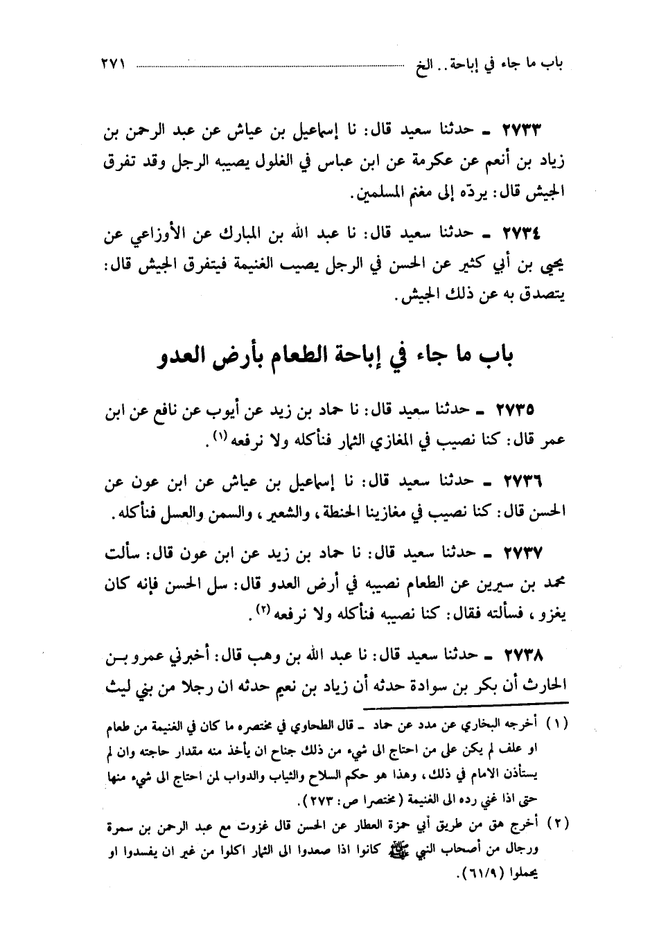 2738- حَدَّثَنَا عَبْدُ اللهِ بْنُ وَهْبٍ ، قَالَ : أَخْبَرَنِي عَمْرُو بْنُ الْحَارِثِ ، أَنَّ بَكْرَ بْنَ سَوَادَةَ حَدَّثَهُ أَنَّ زِيَادَ بْنَ نُعَيْمٍ حَدَّثَهُ أَنَّ رَجُلاً مِنْ بَنِي لَيْثٍ حَدَّثَهُ أَنَّهُمْ كَانُوا مَعَ رَسُولِ اللهِ صَلَّى اللَّهُ عَلَيْهِ وَسَلَّمَ فِي غَزْوَةٍ ، فَكَانَ النَّفَرُ يُصِيبُونَ الْغَنَمَ الْعَظِيمَةَ ، وَلاَ يُصِيبُ الآخَرُونَ إِلاَّ الشَّاةَ ، فَقَالَ رَسُولُ اللهِ صَلَّى اللَّهُ عَلَيْهِ وَسَلَّمَ : لَوْ أَنَّكُمْ أَطْعَمْتُمْ إِخْوَانَكُمْ فَرَمَيْنَا لَهُمْ بِشَاةٍ شَاةٍ ، حَتَّى كَانَ الَّذِي مَعَهُمْ أَكْثَرَ مِنَ الَّذِي مَعَنَا قَالَ بَكْرٌ : وَمَا رَأَيْنَا أَحَدًا قَطُّ يَقْسِمُ الطَّعَامَ كُلَّهُ ، وَلاَ يُنْكِرُ أَخْذَهُ ، وَلَكِنْ يُسْتَمْتَعُ بِهِ ، وَلاَ يُبَاعُ ، فَأَمَّا غَيْرُ الطَّعَامِ مِنْ مَتَاعِ الْعَدُوِّ فَإِنَّهُ يُقَسَّمُ , قَالَ بَكْرٌ : وَقَدْ رَأَيْتُ النَّاسَ يَنْقَلِبُونَ بِالْمَشَاجِبِ ، وَالْعِيدَانِ ، لاَ يُبَاعُ فِي قَسْمٍ لَنَا مِنْ ذَلِكَ شَيْءٌ.