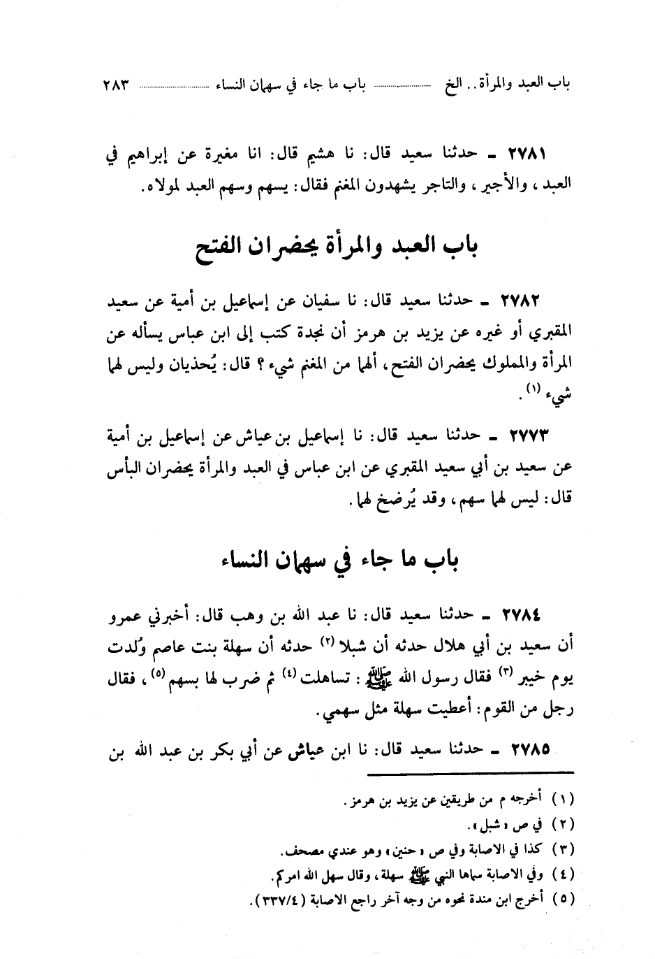 2782- حَدَّثَنَا سُفْيَانُ ، عَنْ إِسْمَاعِيلَ بْنِ أُمَيَّةَ ، عَنْ سَعِيدٍ الْمَقْبُرِيِّ ، أَوْ غَيْرِهِ عَنْ يَزِيدَ بْنِ هُرْمُزَ ، أَنَّ نَجْدَةَ كَتَبَ إِلَى ابْنِ عَبَّاسٍ يَسْأَلُهُ عَنِ الْمَرْأَةِ ، وَالْمَمْلُوكِ ، يَحْضُرَانِ الْفَتْحَ : أَلَهُمَا مِنَ الْمَغْنَمِ شَيْءٌ ؟ قَالَ : يُحْذَيَانِ ، وَلَيْسَ لَهُمَا شَيْءٌ.
