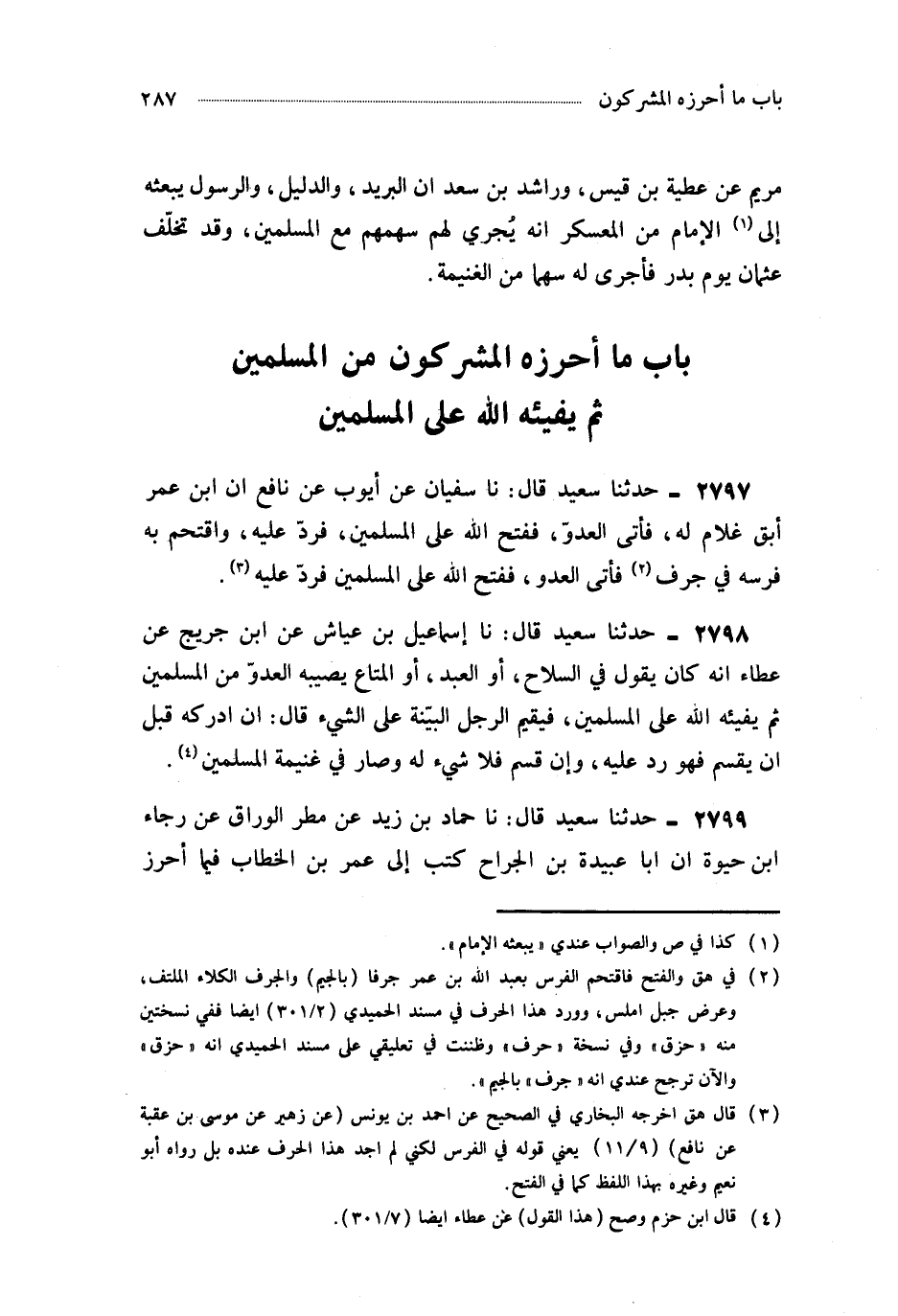 2799- حَدَّثَنَا حَمَّادُ بْنُ زَيْدٍ ، عَنْ مَطَرٍ الْوَرَّاقِ ، عَنْ رَجَاءِ بْنِ حَيْوَةَ ، أَنَّ أَبَا عُبَيْدَةَ بْنَ الْجَرَّاحِ ، كَتَبَ إِلَى عُمَرَ بْنِ الْخَطَّابِ فِيمَا أَحْرَزَ الْمُشْرِكُونَ ، ثُمَّ ظَهَرَ الْمُسْلِمُونَ عَلَيْهِمْ بَعْدُ قَالَ : وَمَنْ وَجَدَ مَالَهُ بِعَيْنِهِ فَهُوَ أَحَقُّ بِهِ مَا لَمْ يُقْسَمْ.