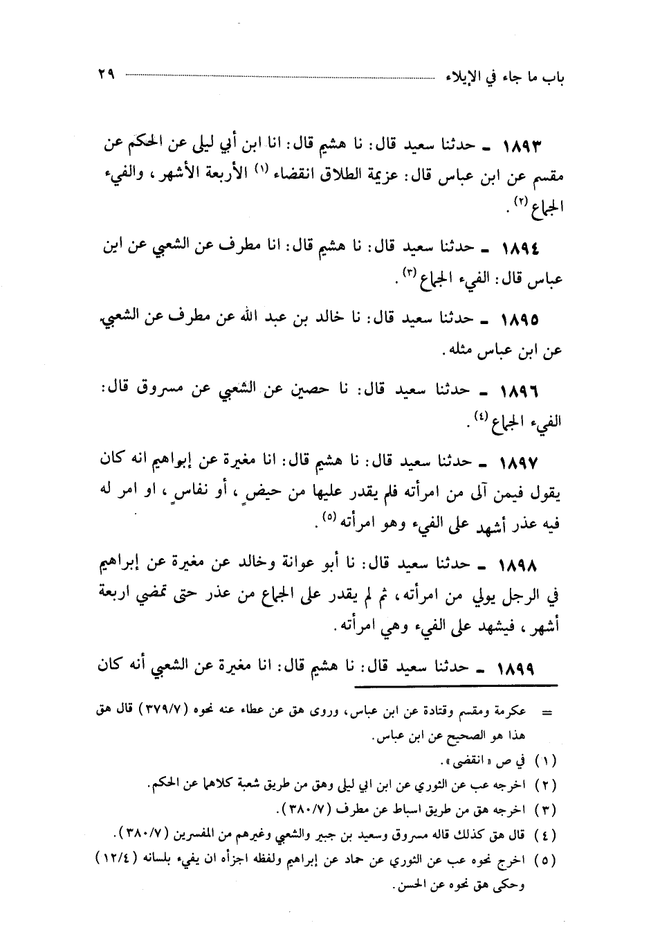 1893- حَدَّثَنَا هُشَيْمٌ ، قَالَ : أَخْبَرَنَا ابْنُ أَبِي لَيْلَى ، عَنِ الْحَكَمِ ، عَنْ مِقْسَمٍ ، عَنِ ابْنِ عَبَّاسٍ ، قَالَ : عَزِيمَةُ الطَّلاَقِ انْقِضَاءُ الأَرْبَعَةِ الأَشْهُرِ ، وَالْفَيْءُ : الْجِمَاعُ.