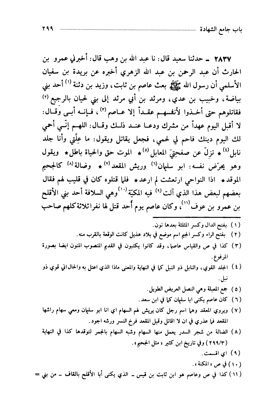 2837- حَدَّثَنَا عَبْدُ اللهِ بْنُ وَهْبٍ ، قَالَ : أَخْبَرَنِي عَمْرُو بْنُ الْحَارِثِ ، أَنَّ عَبْدَ الرَّحْمَنِ بْنَ عَبْدِ اللهِ الزُّهْرِيَّ ، أَخْبَرَهُ عَنْ بُرَيْدَةَ بْنِ سُفْيَانَ الأَسْلَمِيِّ أَنَّ رَسُولَ اللهِ صَلَّى اللَّهُ عَلَيْهِ وَسَلَّمَ بَعَثَ عَاصِمَ بْنَ ثَابِتٍ ، وَزَيْدَ بْنَ دَثِنَةَ أَحَدَ بَنِي بَيَاضَةَ ، وَخُبَيْبَ بْنَ عَدِيٍّ ، وَمَرْثَدَ بْنَ أَبِي مَرْثَدٍ إِلَى بَنِي لِحْيَانَ بِالرَّجِيعِ ، فَقَاتَلُوهُمْ حَتَّى أَخَذُوا لأَنْفُسِهِمْ عَقْدًا إِلاَّ عَاصِم فَإِنَّهُ أَبَى وَقَالَ : لاَ أَقْبَلُ الْيَوْمَ عَهْدًا مِنْ مُشْرِكٍ وَدَعَا عِنْدَ ذَلِكَ ، وَقَالَ : اللَّهُمَّ إِنِّي أَحْمِي لَكَ الْيَوْمَ دِينَكَ فَاحْمِ لِي لَحْمِي ، فَجَعَلَ يُقَاتِلُ وَيَقُولُ :.