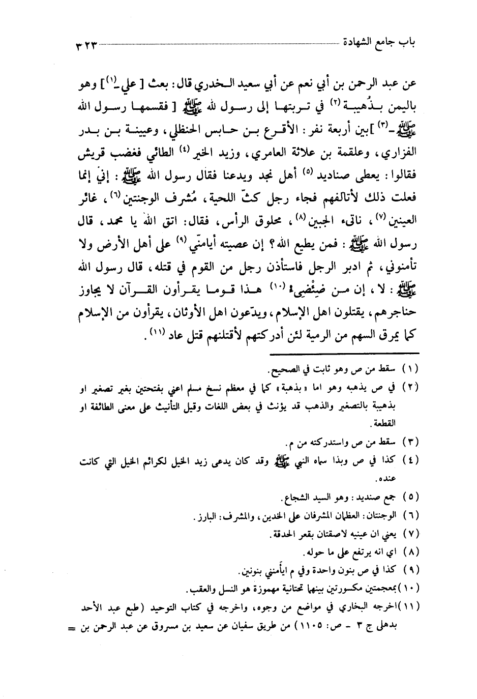2903- حَدَّثَنَا أَبُو الأَحْوَصِ ، عَنْ سَعِيدِ بْنِ مَسْرُوقٍ ، عَنْ عَبْدِ الرَّحْمَنِ بْنِ أَبِي نُعْمٍ ، عَنْ أَبِي سَعِيدٍ الْخُدْرِيِّ ، قَالَ : بَعَثَ عَلِيٌّ وَهُوَ بِالْيَمَنِ بِذُهَيْبَةٍ فِي تُرْبَتِهَا إِلَى رَسُولِ اللهِ صَلَّى اللَّهُ عَلَيْهِ وَسَلَّمَ فَقَسَمَهَا رَسُولُ اللهِ صَلَّى اللَّهُ عَلَيْهِ وَسَلَّمَ بَيْنَ أَرْبَعَةِ نَفَرٍ : الأَقْرَعُ بْنُ حَابِسٍ الْحَنْظَلِيُّ ، وَعُيَيْنَةُ بْنُ بَدْرٍ الْفَزَارِيُّ ، وَعَلْقَمَةُ بْنُ عُلاَثَةَ الْعَامِرِيُّ ، وَزَيْدُ الْخَيْرِ الطَّائِيُّ ، فَغَضِبَ قُرَيْشٌ ، فَقَالُوا : يُعْطِي صَنَادِيدَ أَهْلِ نَجْدٍ وَيَدَعُنَا ، فَقَالَ رَسُولُ اللهِ صَلَّى اللَّهُ عَلَيْهِ وَسَلَّمَ : إِنِّي إِنَّمَا فَعَلْتُ ذَلِكَ لأَتَأَلَّفَهُمْ فَجَاءَ رَجُلٌ كَثُّ اللِّحْيَةِ ، مُشْرِفُ الْوَجْنَتَيْنِ ، غَائِرُ الْعَيْنَيْنِ ، نَاتِئُ الْجَبِينِ ، مَحْلُوقُ الرَّأْسِ ، فَقَالَ : اتَّقِ اللَّهَ يَا مُحَمَّدُ ، قَالَ رَسُولُ اللهِ صَلَّى اللَّهُ عَلَيْهِ وَسَلَّمَ : فَمَنْ يُطِيعُ اللَّهَ إِنْ عَصَيْتُهُ ؟ أَيَأْمَنِّي عَلَى أَهْلِ الأَرْضِ وَلاَ تَأْمَنُونِي ؟ ثُمَّ أَدْبَرَ الرَّجُلُ فَاسْتَأْذَنَ رَجُلٌ مِنَ الْقَوْمِ فِي قَتْلِهِ ، قَالَ رَسُولُ اللهِ صَلَّى اللَّهُ عَلَيْهِ وَسَلَّمَ : لاَ ، إِنَّ مِنْ ضِئْضِئِ هَذَا قَوْمًا يَقْرَؤُونَ الْقُرْآنَ لاَ يُجَاوِزُ حَنَاجِرَهُمْ ، يَقْتُلُونَ أَهْلَ الإِسْلاَمِ ، وَيَدَعُونَ أَهْلَ الأَوْثَانِ ، يَمْرُقُونَ (1) مِنَ الإِسْلاَمِ كَمَا يَمْرُقُ السَّهْمُ مِنَ الرَّمِيَّةِ لَئِنْ أَدْرَكْتُهُمْ لأَقْتُلَنَّهُمْ قَتْلَ عَادٍ.