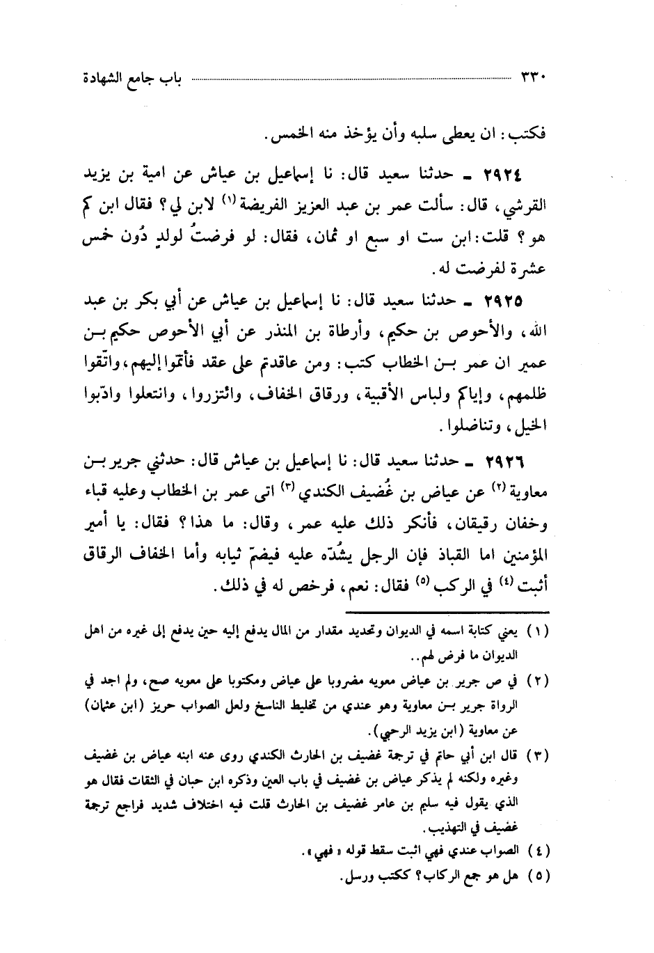 2926- حَدَّثَنَا إِسْمَاعِيلُ بْنُ عَيَّاشٍ ، قَالَ : حَدَّثَنِي جَرِيرُ بْنُ مُعَاوِيَةَ ، عَنْ عِيَاضِ بْنِ غُضَيْفٍ الْكِنْدِيِّ ، أَتَى عُمَرَ بْنَ الْخَطَّابِ وَعَلَيْهِ قَبَاءٌ ، وَخُفَّانِ رَقِيقَانِ ، فَأَنْكَرَ ذَلِكَ عَلَيْهِ عُمَرُ ، وَقَالَ : مَا هَذَا ؟ فَقَالَ : يَا أَمِيرَ الْمُؤْمِنِينَ أَمَّا الْقَبَاءُ فَإِنَّ الرَّجُلَ يَشُدُّهُ عَلَيْهِ فَيَضُمُّ ثِيَابَهُ ، وَأَمَّا الْخِفَافُ الرِّقَاقُ أَثْبَتُ فِي الرُّكَبِ فَقَالَ : نَعَمْ فَرَخَّصَ لَهُ فِي ذَلِكَ.