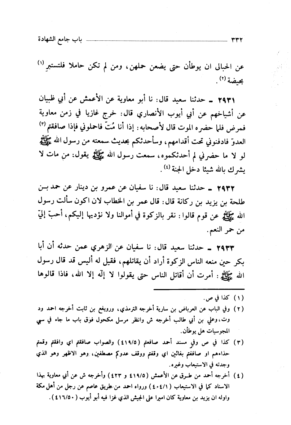 2931- حَدَّثَنَا أَبُو مُعَاوِيَةَ ، عَنِ الأَعْمَشِ ، عَنْ أَبِي ظَبْيَانَ ، عَنْ أَشْيَاخِهِمْ ، عَنْ أَبِي أَيُّوبَ الأَنْصَارِيِّ ، قَالَ : خَرَجَ غَازِيًا فِي زَمَنِ مُعَاوِيَةَ فَمَرِضَ ، فَلَمَّا حَضَرَهُ الْمَوْتُ قَالَ لأَصْحَابِهِ : إِذَا أَنَا مُتُّ فَاحْمِلُونِي ، فَإِذَا صَافَقْتُمُ الْعَدُوَّ فَادْفِنُونِي تَحْتَ أَقْدَامِهِمْ ، وَسَأُحَدِّثُكُمْ بِحَدِيثٍ سَمِعْتُهُ مِنْ رَسُولِ اللهِ صَلَّى اللَّهُ عَلَيْهِ وَسَلَّمَ لَوْلاَ مَا حَضَرَنِي لَمْ أُحَدِّثْكُمُوهُ ، سَمِعْتُ رَسُولَ اللهِ صَلَّى اللَّهُ عَلَيْهِ وَسَلَّمَ يَقُولُ : مَنْ مَاتَ لاَ يُشْرِكُ بِاللَّهِ شَيْئًا دَخَلَ الْجَنَّةَ.