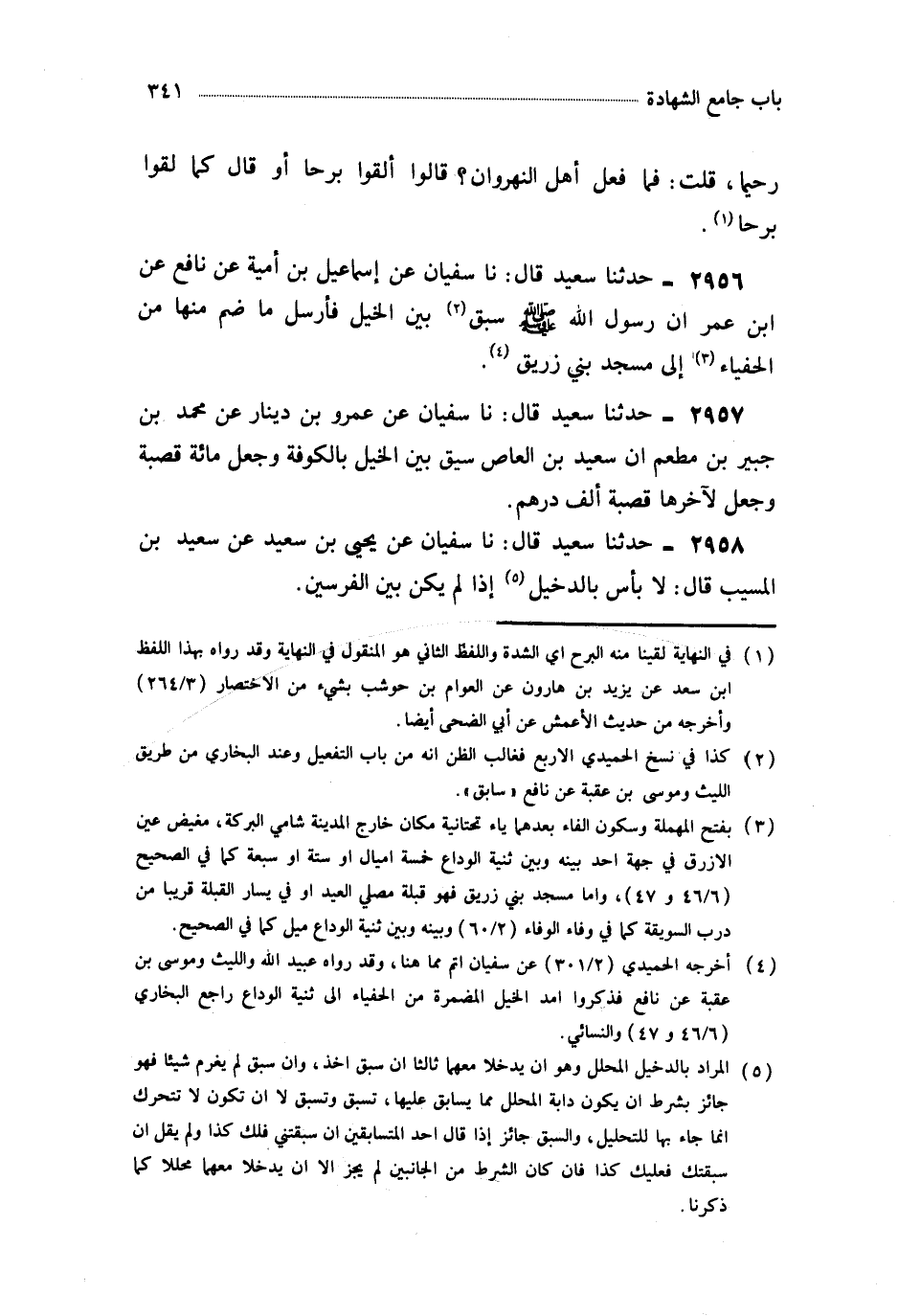 2957- حَدَّثَنَا سُفْيَانُ ، عَنْ عَمْرِو بْنِ دِينَارٍ ، عَنْ مُحَمَّدِ بْنِ جُبَيْرِ بْنِ مُطْعِمٍ ، أَنَّ سَعِيدَ بْنَ الْعَاصِ ، سَبَّقَ بَيْنَ الْخَيْلِ بِالْكُوفَةِ ، وَجَعَلَ مِئَةَ قَصَبَةٍ ، وَجَعَلَ لِآخِرِهَا قَصَبَةً أَلْفَ دِرْهَمٍ.