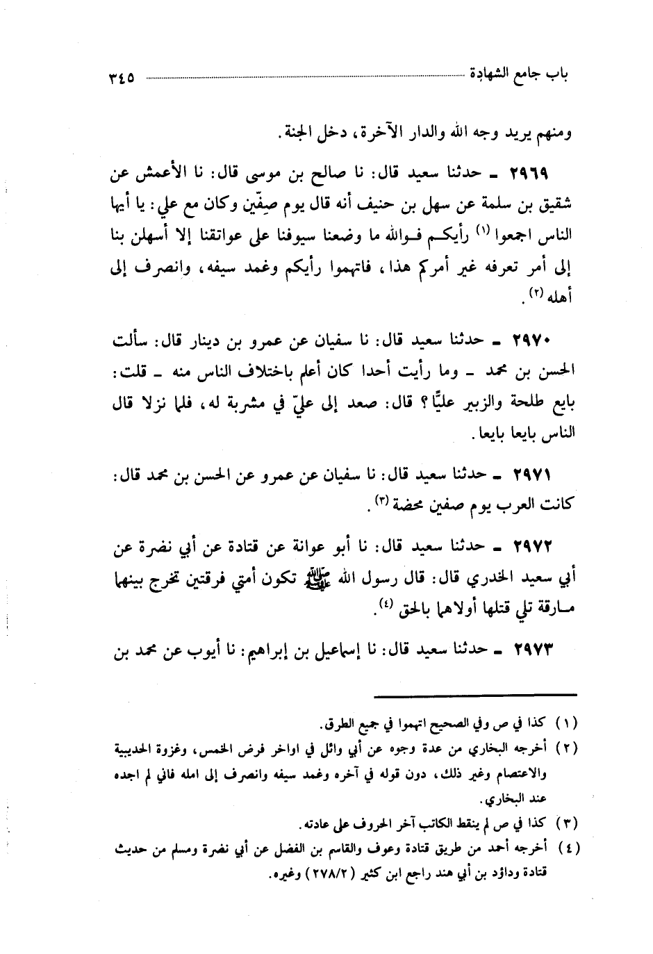 2972- حَدَّثَنَا أَبُو عَوَانَةَ ، عَنْ قَتَادَةَ ، عَنْ أَبِي نَضْرَةَ ، عَنْ أَبِي سَعِيدٍ الْخُدْرِيِّ ، قَالَ : قَالَ رَسُولُ اللهِ صَلَّى اللَّهُ عَلَيْهِ وَسَلَّمَ : تَكُونُ أُمَّتِي فِرْقَتَيْنِ تَخْرُجُ بَيْنَهُمَا مَارِقَةٌ تَلِي قَتْلَهَا أَوْلاَهُمَا بِالْحَقِّ.