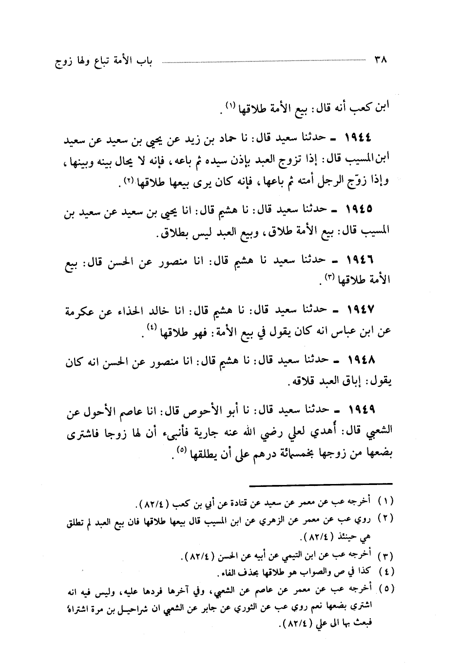 1945- حَدَّثَنَا هُشَيْمٌ ، قَالَ : أَخْبَرَنَا يَحْيَى بْنُ سَعِيدٍ ، عَنْ سَعِيدِ بْنِ الْمُسَيَّبِ ، قَالَ : بَيْعُ الأَمَةِ طَلاَقٌ ، وَبَيْعُ الْعَبْدِ لَيْسَ بِطَلاَقٍ.