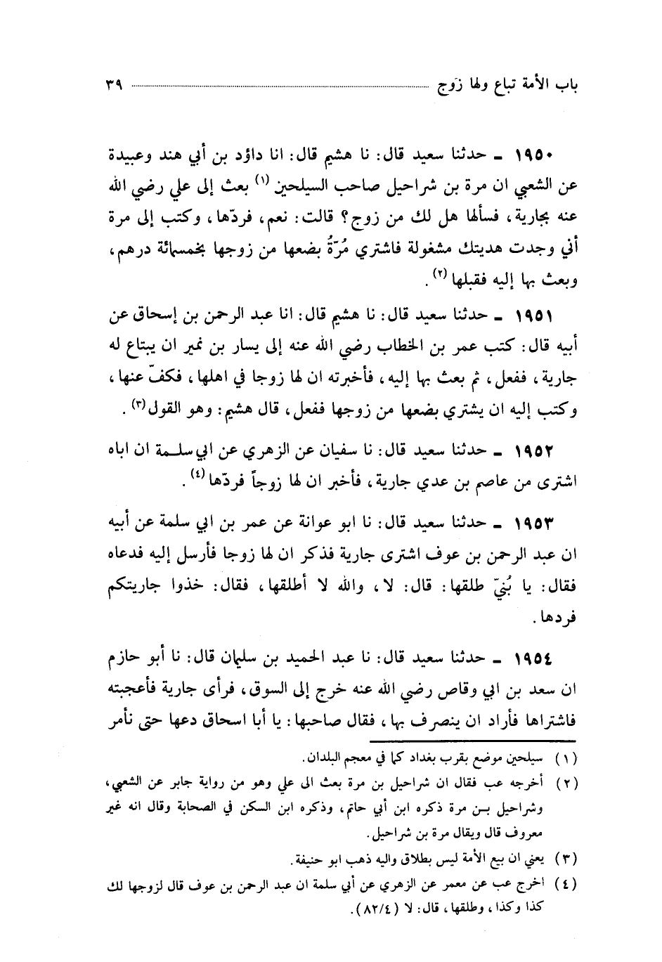 1950- حَدَّثَنَا هُشَيْمٌ ، قَالَ : أَخْبَرَنَا دَاوُدُ بْنُ أَبِي هِنْدَ ، وَعُبَيْدَةُ ، عَنِ الشَّعْبِيِّ ، أَنَّ مُرَّةَ بْنَ شَرَاحِيلَ ، صَاحِبَ السَّيْلَحِينِ بَعَثَ إِلَى عَلِيٍّ رَضِيَ اللَّهُ عَنْهُ بِجَارِيَةٍ ، فَسَأَلَهَا هَلْ لَكِ مِنْ زَوْجٍ ؟ قَالَتْ : نَعَمْ ، فَرَدَّهَا ، وَكَتَبَ إِلَى مُرَّةَ : إِنِّي وَجَدْتُ هَدِيَّتَكَ مَشْغُولَةً فَاشْتَرَى مُرَّةُ بُضْعَهَا مِنْ زَوْجِهَا بِخَمْسِمِائَةِ دِرْهَمٍ ، وَبَعَثَ بِهَا إِلَيْهِ فَقَبِلَهَا.