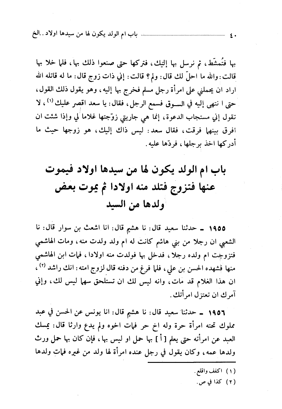 1955- حَدَّثَنَا هُشَيْمٌ ، قَالَ : أَخْبَرَنَا أَشْعَثُ بْنُ سَوَّارٍ ، قَالَ : حَدَّثَنَا الشَّعْبِيُّ ، أَنَّ رَجُلاً مِنْ بَنِي هَاشِمٍ كَانَتْ لَهُ أُمُّ وَلَدٍ وَلَدَتْ مِنْهُ ، وَمَاتَ الْهَاشِمِيُّ فَتَزَوَّجَتْ أُمُّ وَلَدِهِ رَجُلاً فَدَخَلَ بِهَا ، فَوَلَدَتْ مِنْهُ أَوْلاَدًا ، فَمَاتَ ابْنُ الْهَاشِمِيِّ مِنْهَا ، فَشَهِدَهُ الْحَسَنُ بْنُ عَلِيٍّ ، فَلَمَّا فَرَغَ مِنْ دَفْنِهِ قَالَ لِزَوْجِ أَمَتِهِ : إِنَّكَ رَاشِدٌ ، إِنَّ هَذَا الْغُلاَمَ قَدْ مَاتَ ، وَإِنَّهُ لَيْسَ لَكَ أَنْ تَسْتَلْحِقَ سَهْمًا لَيْسَ لَكَ ، وَإِنِّي آمُرُكَ أَنْ تَعْتَزِلَ امْرَأَتَكَ.