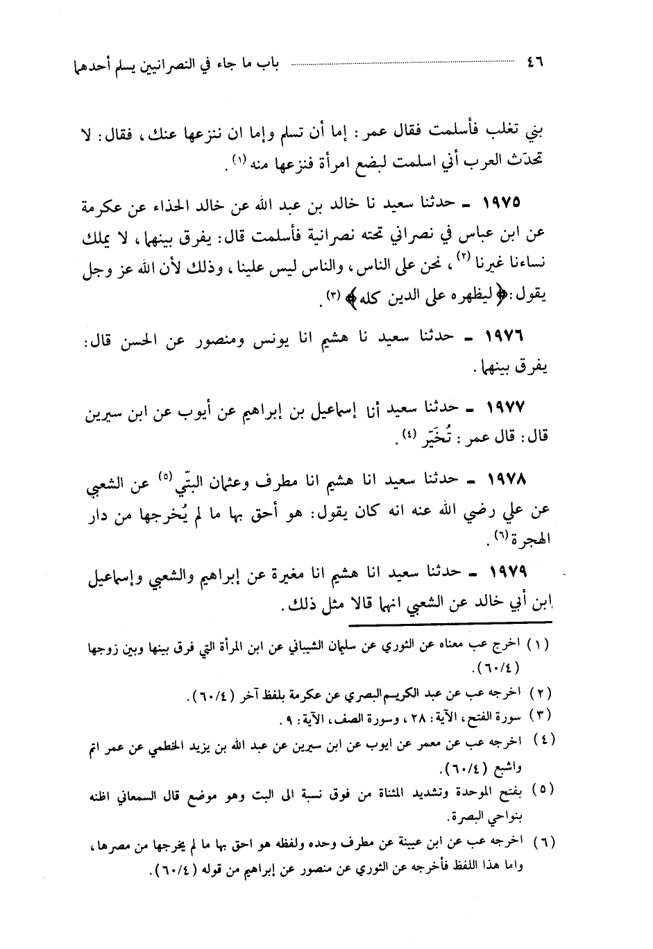 1975- حَدَّثَنَا خَالِدُ بْنُ عَبْدِ اللهِ ، عَنْ خَالِدٍ الْحَذَّاءِ ، عَنْ عِكْرِمَةَ ، عَنِ ابْنِ عَبَّاسٍ ، فِي نَصْرَانِيٍّ تَحْتَهُ نَصْرَانِيَّةٌ ، فَأَسْلَمَتْ ، قَالَ : يُفَرَّقُ بَيْنَهُمَا ، لاَ يَمْلِكُ نِسَاءَنَا غَيْرُنَا ، نَحْنُ عَلَى النَّاسِ ، وَالنَّاسُ لَيْسَ عَلَيْنَا ؛ وَذَلِكَ لأَنَّ اللَّهَ عَزَّ وَجَلَّ يَقُولُ : {لِيُظْهِرَهُ عَلَى الدِّينِ كُلِّهِ}.