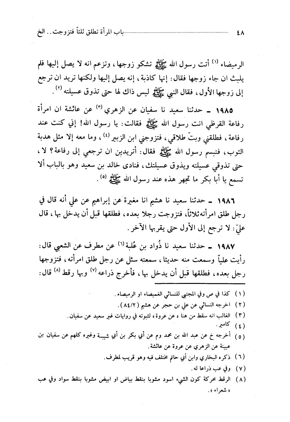 1987- حَدَّثَنَا ذَوَّادُ بْنُ عُلْبَةَ ، عَنْ مُطَرِّفٍ ، عَنِ الشَّعْبِيِّ ، قَالَ : رَأَيْتُ عَلِيًّا ، وَسَمِعْتُ مِنْهُ حَدِيثًا سَمِعْتُهُ سُئِلَ عَنْ رَجُلٍ طَلَّقَ امْرَأَتَهُ ، فَتَزَوَّجَهَا رَجُلٌ بَعْدَهُ ، فَطَلَّقَهَا قَبْلَ أَنْ يَدْخُلَ بِهَا ، فَأَخْرَجَ ذِرَاعَهُ ، وَبِهَا رَقَطٌ قَالَ : لاَ ، حَتَّى يَهُزَّهَا.