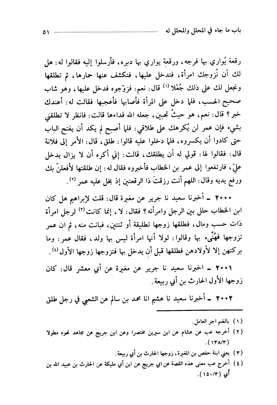 2000- أَخْبَرَنَا سَعِيدٌ ، حَدَّثَنَا جَرِيرٌ ، عَنْ مُغِيرَةَ ، قَالَ : قُلْتُ لِإِبْرَاهِيمَ هَلْ كَانَ ابْنُ الْخَطَّابِ حَلَّلَ بَيْنَ الرَّجُلِ وَامْرَأَتِهِ ؟ فَقَالَ : لاَ ، إِنَّمَا كَانَتْ لِرَجُلٍ امْرَأَةٌ ذَاتُ حَسَبٍ وَمَالٍ ، فَطَلَّقَهَا زَوْجُهَا تَطْلِيقَةً أَوْ ثِنْتَيْنِ ، فَبَانَتْ مِنْهُ ، ثُمَّ إِنَّ عُمَرَ تَزَوَّجَهَا فَهُنِّئَ بِهَا ، وَقَالُوا : لَوْلاَ أَنَّهَا امْرَأَةٌ لَيْسَ بِهَا وَلَدٌ ، فَقَالَ عُمَرُ : وَمَا بَرَكَتُهُنَّ إِلاَّ لأَوْلاَدِهِنَّ فَطَلَّقَهَا قَبْلَ أَنْ يَدْخُلَ بِهَا ، فَتَزَوَّجَهَا زَوْجُهَا الأَوَّلُ.