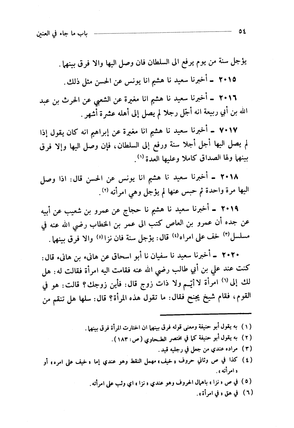 2017- أَخْبَرَنَا سَعِيدٌ ، حَدَّثَنَا هُشَيْمٌ ، أَخْبَرَنَا مُغِيرَةُ ، عَنْ إِبْرَاهِيمَ ، أَنَّهُ كَانَ يَقُولُ : إِذَا لَمْ يَصِلْ إِلَيْهَا أُجِّلَ أَجَلاً سَنَةً ، وَرُفِعَ إِلَى السُّلْطَانِ ، فَإِنْ وَصَلَ إِلَيْهَا ، وَإِلاَّ فُرِّقَ بَيْنَهُمَا ، وَلَهَا الصَّدَاقُ كَامِلاً ، وَعَلَيْهَا الْعِدَّةُ.