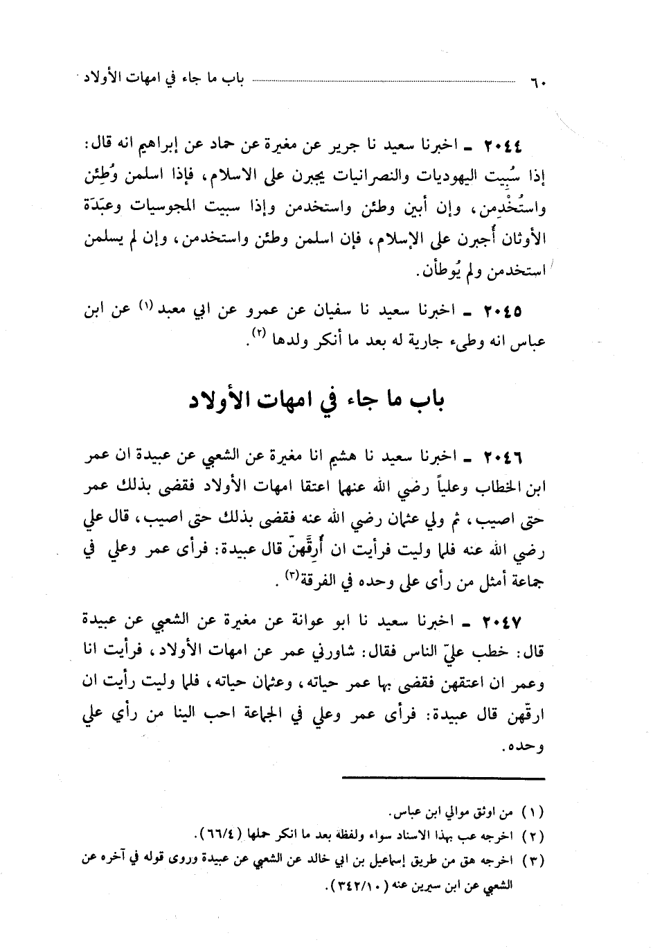 2046- أَخْبَرَنَا سَعِيدٌ ، حَدَّثَنَا هُشَيْمٌ ، أَخْبَرَنَا مُغِيرَةُ ، عَنِ الشَّعْبِيِّ ، عَنْ عَبِيدَةَ أَنَّ عُمَرَ بْنَ الْخَطَّابِ ، وَعَلِيًّا ، رَضِيَ اللَّهُ عَنْهُمَا أَعْتَقَا أُمَّهَاتِ الأَوْلاَدِ ، فَقَضَى بِذَلِكَ عُمَرُ حَتَّى أُصِيبَ ، ثُمَّ وَلِيَ عُثْمَانُ رَضِيَ اللَّهُ عَنْهُ فَقَضَى بِذَلِكَ حَتَّى أُصِيبَ ، قَالَ عَلِيٌّ رَضِيَ اللَّهُ عَنْهُ : فَلَمَّا وُلِّيتُ فَرَأَيْتُ أَنْ أُرِقَّهُنَّ قَالَ عَبِيدَةُ : فَرَأْيُ عُمَرَ وَعَلِيٍّ فِي جَمَاعَةٍ أَمْثَلُ مِنْ رَأْيِ عَلِيٍّ وَحْدَهُ فِي الْفُرْقَةِ.