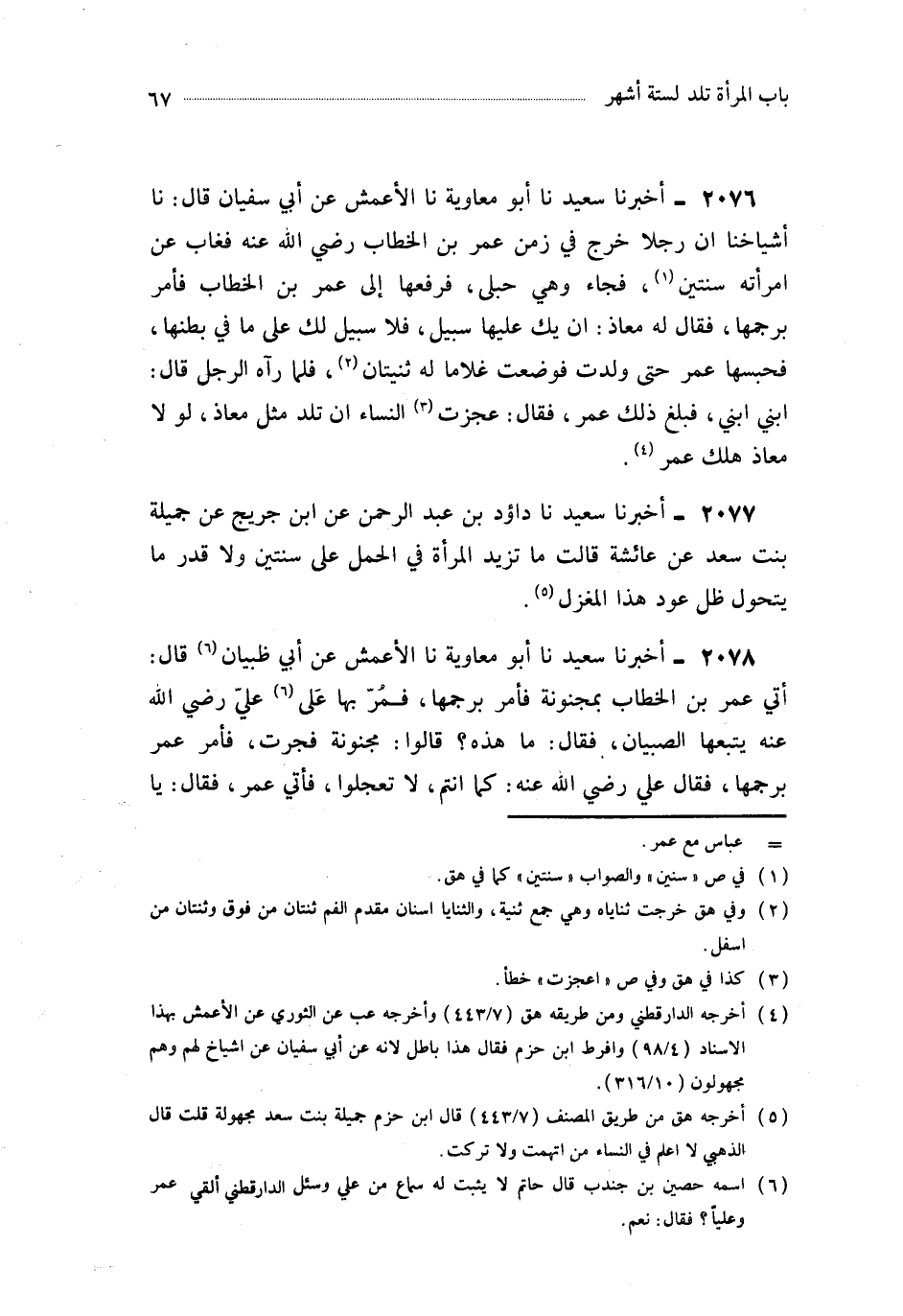2076- أَخْبَرَنَا سَعِيدٌ ، حَدَّثَنَا أَبُو مُعَاوِيَةَ ، حَدَّثَنَا الأَعْمَشُ ، عَنْ أَبِي سُفْيَانَ ، قَالَ : حَدَّثَنَا أَشْيَاخُنَا أَنَّ رَجُلاً خَرَجَ فِي زَمَنِ عُمَرَ بْنِ الْخَطَّابِ رَضِيَ اللَّهُ عَنْهُ فَغَابَ عَنِ امْرَأَتِهِ سَنَتَيْنِ ، فَجَاءَ وَهِيَ حُبْلَى فَرَفَعَهَا إِلَى عُمَرَ بْنِ الْخَطَّابِ فَأَمَرَ بِرَجْمِهَا ، فَقَالَ لَهُ مُعَاذٌ : إِنْ يَكُ عَلَيْهَا سَبِيلٌ ، فَلاَ سَبِيلَ لَكَ عَلَى مَا فِي بَطْنِهَا ، فَحَبَسَهَا عُمَرُ حَتَّى وَلَدَتْ فَوَضَعَتْ غُلاَمًا لَهُ ثِنْيَتَانِ ، فَلَمَّا رَآهُ الرَّجُلُ قَالَ : ابْنِي ابْنِي ، فَبَلَغَ ذَلِكَ عُمَرَ ، فَقَالَ : عَجَزَتِ النِّسَاءُ أَنْ تَلِدَ مِثْلَ مُعَاذٍ ، لَوْلاَ مُعَاذٌ هَلَكَ عُمَرُ.