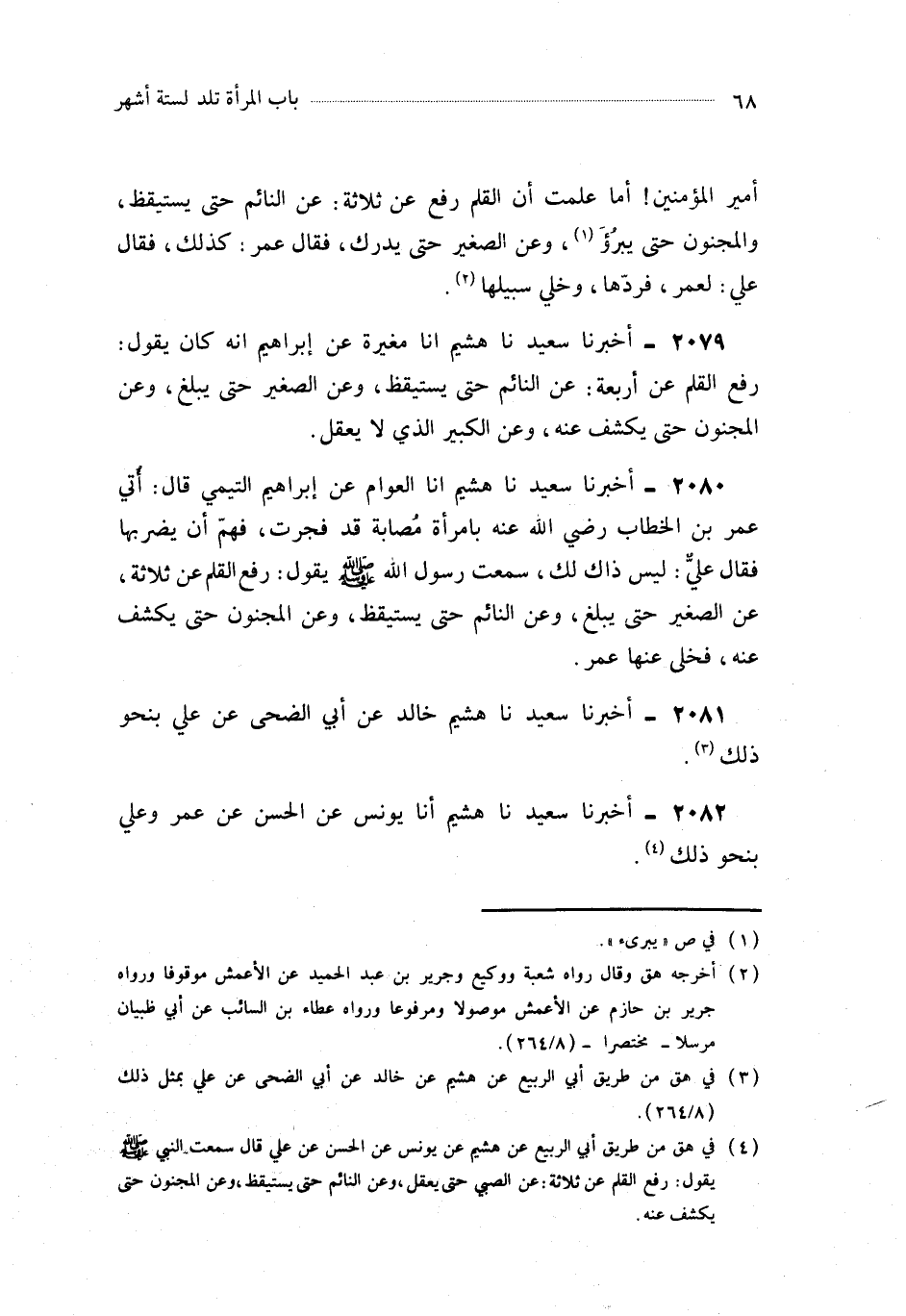 2079- أَخْبَرَنَا سَعِيدٌ ، حَدَّثَنَا هُشَيْمٌ ، أَخْبَرَنَا مُغِيرَةُ ، عَنْ إِبْرَاهِيمَ ، أَنَّهُ كَانَ يَقُولُ : رُفِعَ الْقَلَمُ عَنْ أَرْبَعَةٍ : عَنِ النَّائِمِ حَتَّى يَسْتَيْقِظَ ، وَعَنِ الصَّغِيرِ حَتَّى يَبْلُغَ ، وَعَنِ الْمَجْنُونِ حَتَّى يُكْشَفَ عَنْهُ ، وَعَنِ الْكَبِيرِ الَّذِي لاَ يَعْقِلُ.