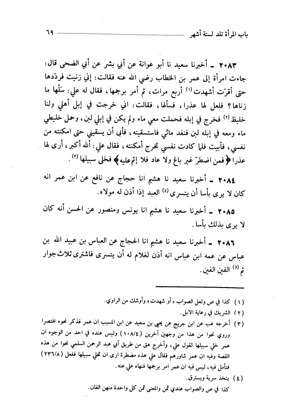 2083- أَخْبَرَنَا سَعِيدٌ ، حَدَّثَنَا أَبُو عَوَانَةَ ، عَنْ أَبِي بِشْرٍ ، عَنْ أَبِي الضُّحَى ، قَالَ : جَاءَتِ امْرَأَةٌ إِلَى عُمَرَ بْنِ الْخَطَّابِ رَضِيَ اللَّهُ عَنْهُ فَقَالَتْ : إِنِّي زَنَيْتُ فَرَدَّدَهَا حَتَّى أَقَرَّتْ أَشَهِدَتْ أَرْبَعَ مَرَّاتٍ ، ثُمَّ أَمَرَ بِرَجْمِهَا فَقَالَ لَهُ عَلِيٌّ : سَلْهَا مَا زِنَاهَا فَلَعَلَّ لَهَا عُذْرًا ؟ فَسَأَلَهَا ، فَقَالَتْ : إِنِّي خَرَجْتُ فِي إِبِلِ أَهْلِي ، وَلَنَا خَلِيطٌ ، فَخَرَجَ فِي إِبِلِهِ فَحَمَلْتُ مَعِي مَاءً ، وَلَمْ يَكُنْ فِي إِبِلِي لَبَنٌ ، وَحَمَلَ خَلِيطِي مَاءً ، وَمَعَهُ فِي إِبِلِهِ لَبَنٌ ، فَنَفِدَ مَائِي فَاسْتَسْقَيْتُهُ ، فَأَبَى أَنْ يَسْقِيَنِي حَتَّى أُمْكِنَتهُ مِنْ نَفْسِي ، فَأَبَيْتُ ، فَلَمَّا كَادَتْ نَفْسِي تَخْرُجُ أَمْكَنْتُهُ ، فَقَالَ عَلِيٌّ : اللَّهُ أَكْبَرُ ، أَرَى لَهَا عُذْرًا {فَمَنِ اضْطُرَّ غَيْرَ بَاغٍ وَلاَ عَادٍ فَلاَ إِثْمَ عَلَيْهِ} فَخَلَّى سَبِيلَهَا.
