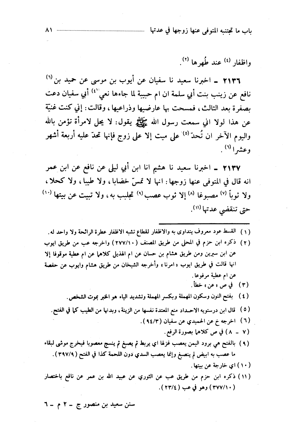 2137- أَخْبَرَنَا سَعِيدٌ ، حَدَّثَنَا هُشَيْمٌ ، أَخْبَرَنَا ابْنُ أَبِي لَيْلَى ، عَنْ نَافِعٍ ، عَنِ ابْنِ عُمَرَ ، أَنَّهُ قَالَ فِي الْمُتَوَفَّى عَنْهَا زَوْجُهَا : إِنَّهَا لاَ تَمَسُّ خِضَابًا ، وَلاَ طِيبًا ، وَلاَ كُحْلاً ، وَلاَ ثَوْبًا مَصْبُوغًا إِلاَّ ثَوْبَ عَصْبٍ تَجَلْبَبُ بِهِ ، وَلاَ تَبِيتُ عَنْ بَيْتِهَا حَتَّى تَنْقَضِي عِدَّتُهَا