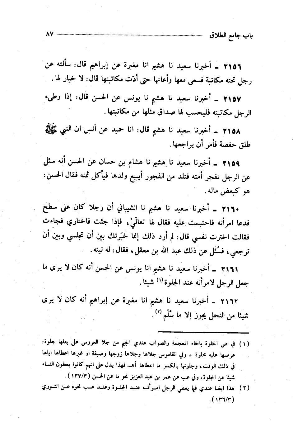 2161- أَخْبَرَنَا سَعِيدٌ ، حَدَّثَنَا هُشَيْمٌ ، أَخْبَرَنَا يُونُسُ ، عَنِ الْحَسَنِ أَنَّهُ كَانَ لاَ يَرَى مَا جَعَلَ الرَّجُلُ لاِمْرَأَتِهِ عِنْدَ الْجِلْوَةِ شَيْئًا.