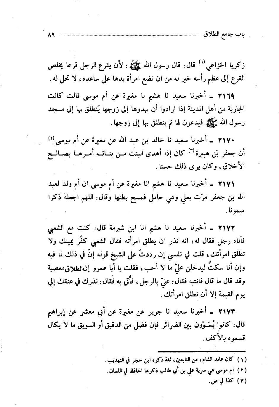 2172- أَخْبَرَنَا سَعِيدٌ ، حَدَّثَنَا هُشَيْمٌ ، أَخْبَرَنَا ابْنُ شُبْرُمَةَ ، قَالَ : كُنْتُ مَعَ الشَّعْبِيِّ ، فَأَتَاهُ رَجُلٌ ، فَقَالَ لَهُ : إِنَّهُ نَذَرَ أَنْ يُطَلِّقَ امْرَأَتَهُ ، فَقَالَ الشَّعْبِيُّ : كَفِّرْ يَمِينَكَ ، وَلاَ تُطَلِّقِ امْرَأَتَكَ قُلْتُ فِي نَفْسِي : إِنْ رَدَدْتُ عَلَى الشَّيْخِ قَوْلَهُ إِنَّ فِي ذَلِكَ لَمَا فِيهِ ، وَإِنْ أَنَا سَكَتُّ لَيَدْخُلَنَّ عَلَيَّ مَا لاَ أُحِبُّ ، فَقُلْتُ : يَا أَبَا عَمْرٍو ، إِنَّ الطَّلاَقَ مَعْصِيَةٌ ، وَقَدْ قَالَ مَا قَالَ فَانْتَبِهْ ، فَقَالَ : عَلَيَّ بِالرَّجُلِ ، فَأُتِيَ بِهِ ، فَقَالَ : نَذْرُكَ فِي عُنُقِكَ إِلَى يَوْمِ الْقِيَامَةِ إِلاَّ أَنْ تُطَلِّقَ امْرَأَتَكَ.