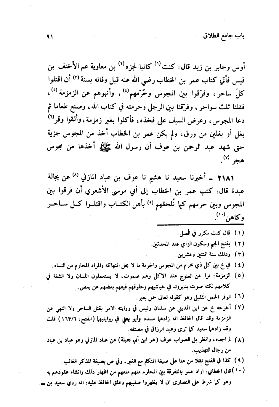 2181- أَخْبَرَنَا سَعِيدٌ ، حَدَّثَنَا هُشَيْمٌ ، حَدَّثَنَا عَوْفُ بْنُ عَبَّادٍ الْمَازِنِيُّ ، عَنْ بَجَالَةَ عَبْدَةَ ، قَالَ : كَتَبَ عُمَرُ بْنُ الْخَطَّابِ إِلَى أَبِي مُوسَى الأَشْعَرِيِّ أَنْ فَرِّقُوا بَيْنَ الْمَجُوسِ وَبَيْنَ حُرَمِهِمْ كَيْمَا نُلْحِقَهُمْ بِأَهْلِ الْكِتَابِ ، وَاقْتُلُوا كُلَّ سَاحِرٍ وَكَاهِنٍ.