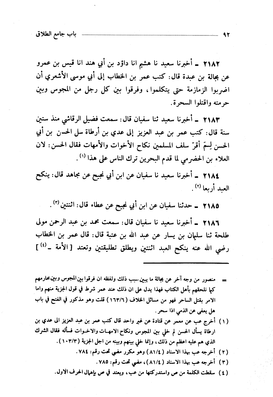 2182- أَخْبَرَنَا سَعِيدٌ ، حَدَّثَنَا هُشَيْمٌ ، أَخْبَرَنَا دَاوُدُ بْنُ أَبِي هِنْدَ ، أَخْبَرَنَا قَيْسُ بْنُ عَمْرٍو ، عَنْ بَجَالَةَ بْنِ عَبْدَةَ ، قَالَ : كَتَبَ عُمَرُ بْنُ الْخَطَّابِ إِلَى أَبِي مُوسَى الأَشْعَرِيِّ أَنِ اضْرِبُوا الزَّمَازِمَةَ ، حَتَّى يَتَكَلَّمُوا ، وَفَرِّقُوا بَيْنَ كُلِّ رَجُلٍ مِنَ الْمَجُوسِ وَبَيْنَ حُرْمَتِهِ ، وَاقْتُلُوا السَّحَرَةَ.