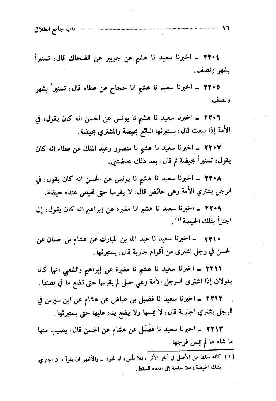 2210- أَخْبَرَنَا سَعِيدٌ ، حَدَّثَنَا عَبْدُ اللهِ بْنُ الْمُبَارَكِ ، عَنْ هِشَامِ بْنِ حَسَّانَ ، عَنِ الْحَسَنِ فِي رَجُلٍ اشْتَرَى مِنْ أَقْوَامٍ جَارِيَةً قَالَ : يَسْتَبْرِئُهَا.