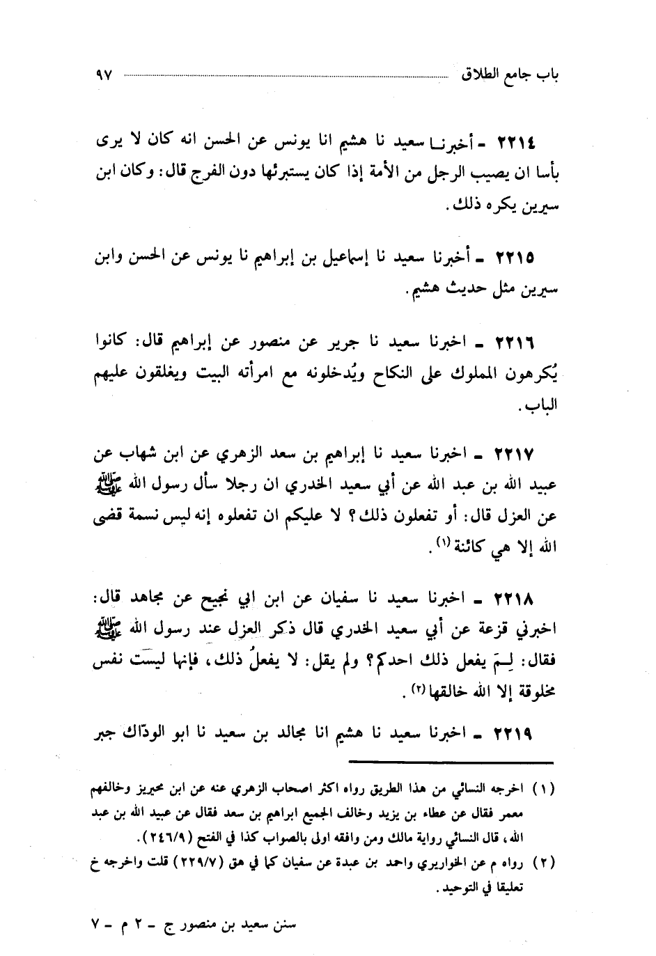 2219- أَخْبَرَنَا سَعِيدٌ ، حَدَّثَنَا هُشَيْمٌ ، أَخْبَرَنَا مُجَالِدُ بْنُ سَعِيدٍ ، حَدَّثَنَا أَبُو الْوَدَّاكِ جَبْرُ بْنُ نَوْفٍ ، عَنْ أَبِي سَعِيدٍ الْخُدْرِيِّ ، قَالَ : أَصَبْنَا سَبَايَا فَأَرَدْنَا أَنْ نُفَادِيَ بِهِنَّ ، فَسَأَلْنَا رَسُولَ اللهِ صَلَّى اللَّهُ عَلَيْهِ وَسَلَّمَ ، فَقُلْنَا : الرَّجُلُ تَكُونُ لَهُ الأَمَةُ فَيُصِيبُ مِنْهَا وَيَعْزِلُ عَنْهَا مَخَافَةَ أَنْ تَعْلَقَ مِنْهُ ، فَقَالَ : افْعَلُوا مَا بَدَا لَكُمْ فَمَا يُقْضَ مِنْ أَمْرٍ يَكُنْ وَإِنْ كَرِهْتُمْ.