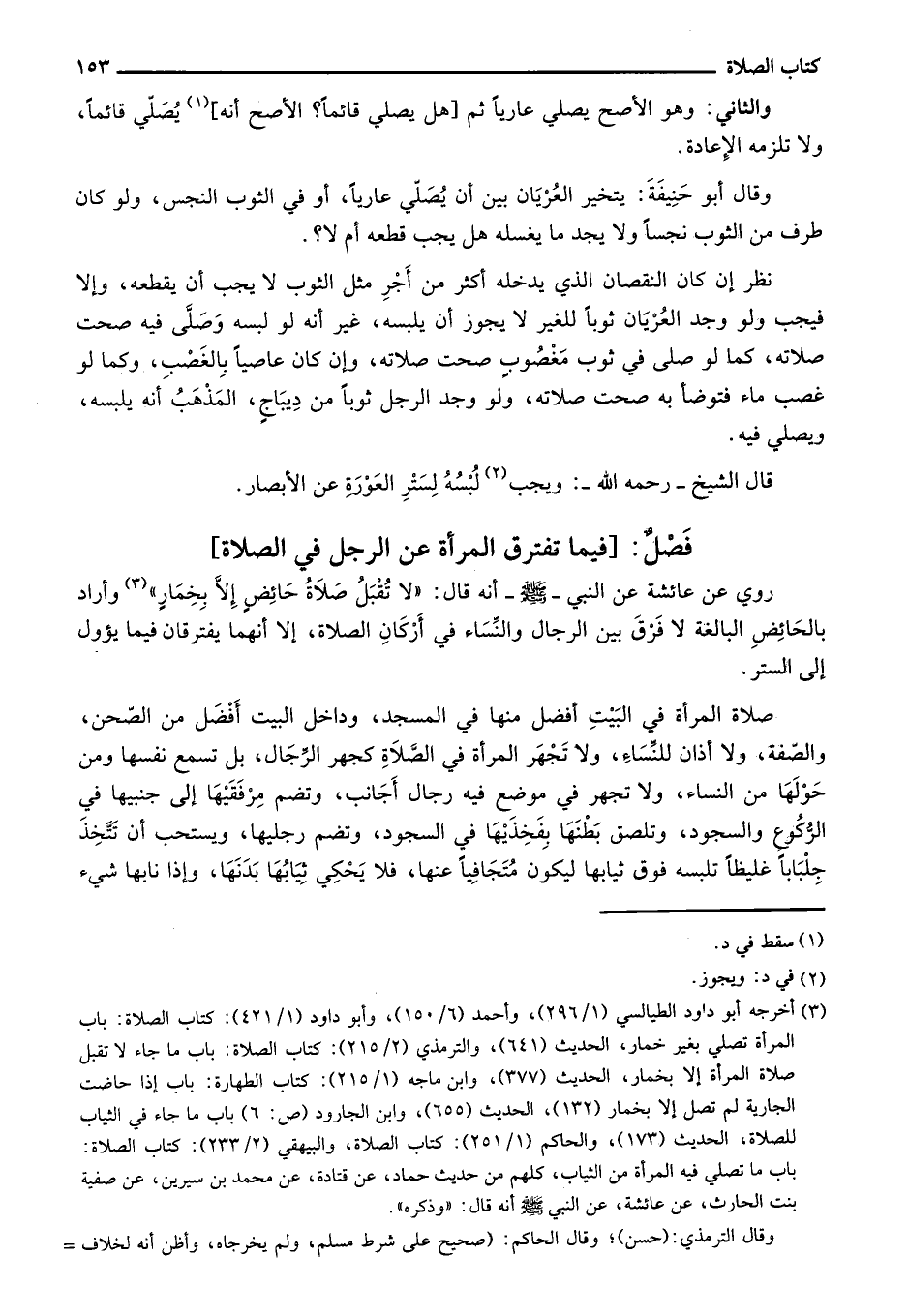 روي عن عائشة عن النبي- صلى الله عليه وسلم- أنه قال: "لا تُقبل صلاة حائض إلا بخمار" وأراد بالحائض البالغة لا فرق بين الرجال والنساء في أركان الصلاة، إلا أنهما يفترقان فيما يؤول إلى الستر.
