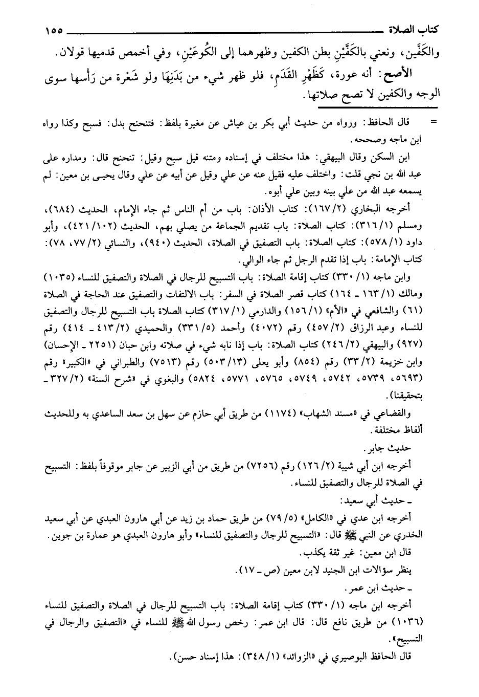 والكفَّين، ونعني بالكفَّين بطن الكفين وظهرهما إلى الكُوعين، وفي أخمص قدميها قولان.