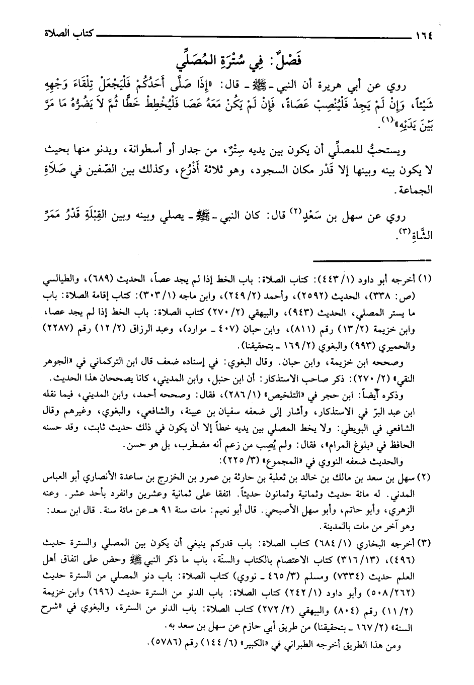 روي عن أبي هريرة أن النبي- صلى الله عليه وسلم- قال: "إذا صلَّى أحدُكم فليجعل تلقاء وجهه شيئاً، وإن لم يجد فلينصب عصاةً، فإن لم يكن معه عصا فليخطط خطاً ثمَّ لا يضره ما مر بين يديه".