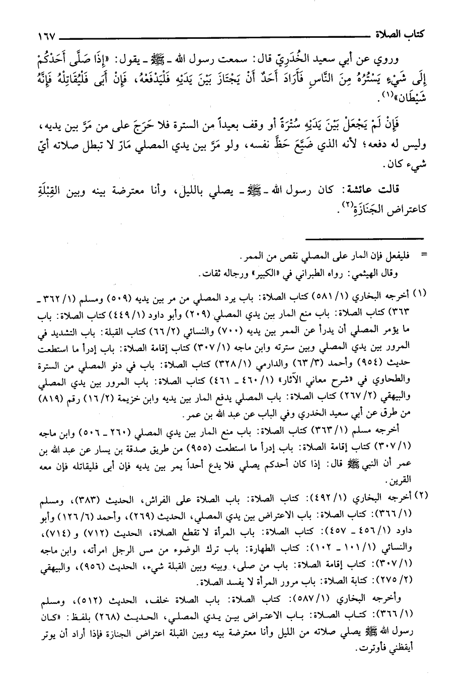 وروي عن أبي سعيد الخُدري قال: سمعت رسول الله- صلى الله عليه وسلم- يقول: "إذا صلى أحدكُم إلى شيءٍ يستره من الناس فأراد أحدٌ أن يجتاز بين يديه فليدفعه، فإن أبى فليقاتله فإنه شيطان".