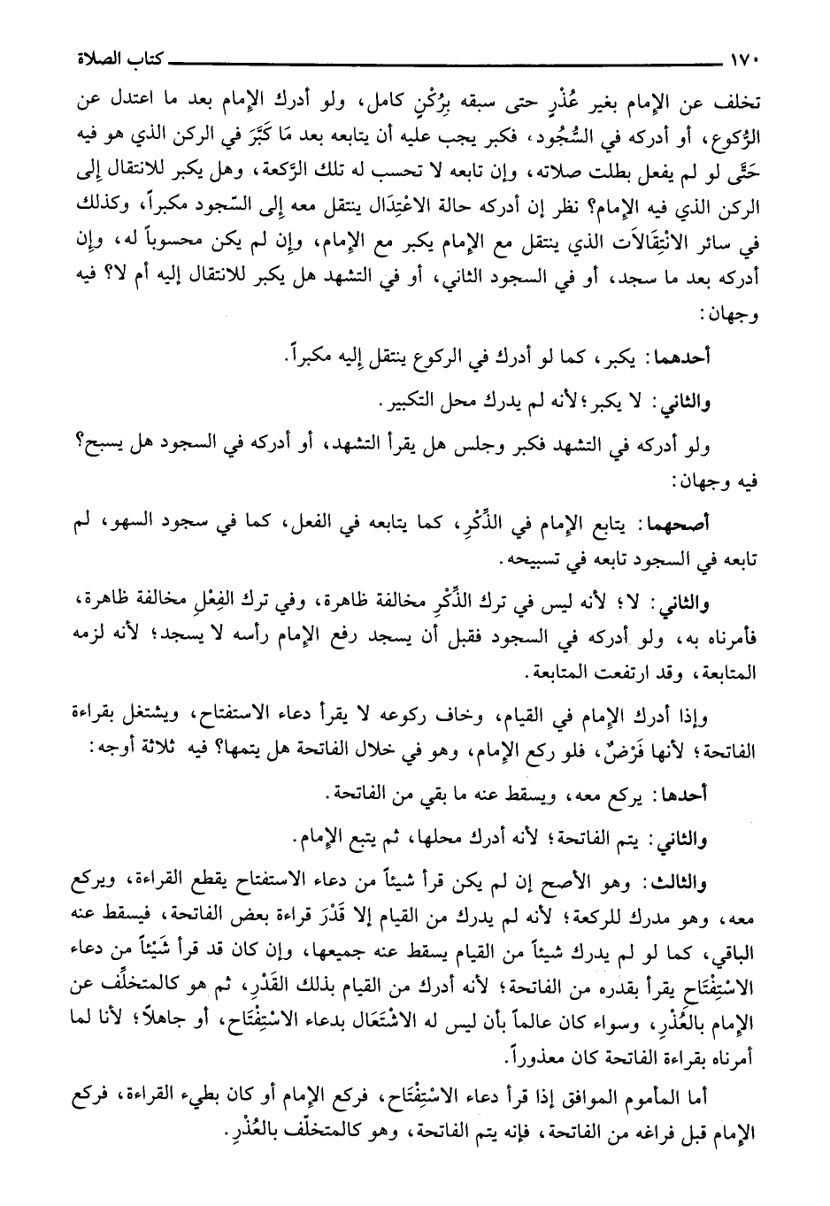 تخلف عن الإمام بغير عذر حتى سبقه بركن كامل، ولو أدرك الإمام بعد ما اعتدل عن الركوع، أو أدركه في السجود، فكبر يجب عليه أن يتابعه بعد ما كبر في الركن الذي هو فيه حتى لو لم يفعل بطلت صلاته، وإن تابعه لا تحسب له تلك الركعة، وهل يكبر للانتقال إلى الركن الذي فيه الإمام؟ نظر إن أدركه حالة الاعتدال ينتقل معه إلى السجود مكبراً، وكذلك في سائر الانتقالات الذي ينتقل مع الإمام يكبر مع الإمام، وإن لم يكن محسوباً له، وإن أدركه بعد ما سجد، أو في السجود الثاني، أو في التشهد هل يكبر للانتقال إليه أم لا؟ فيه وجهان: