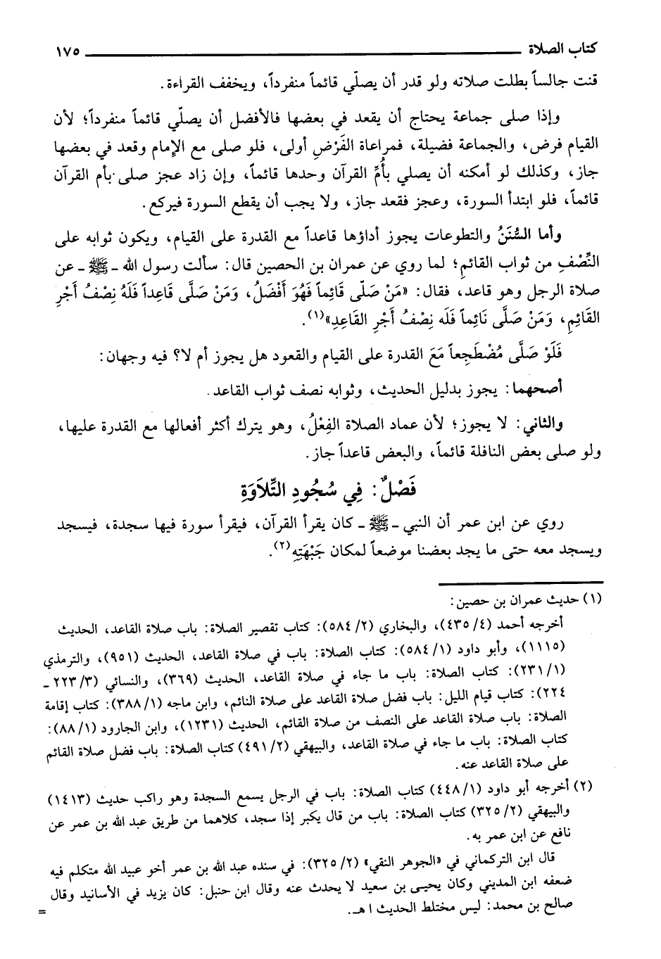 وأما السُّنن والتطوعات يجوز أداؤها قاعداً مع القدرة على القيام، ويكون ثوابه على النصف من ثواب القائم؛ لما روي عن عمران بن الحصين قال: سألت رسول الله- صلى الله عليه وسلم- عن صلاة الرجل وهو قاعد، فقال: "من صلى قائماً فهو أفضل، ومن صلى قاعداً فله نصف أجر القائم، ومن صلى نائماً فله نصف أجر القاعد".
