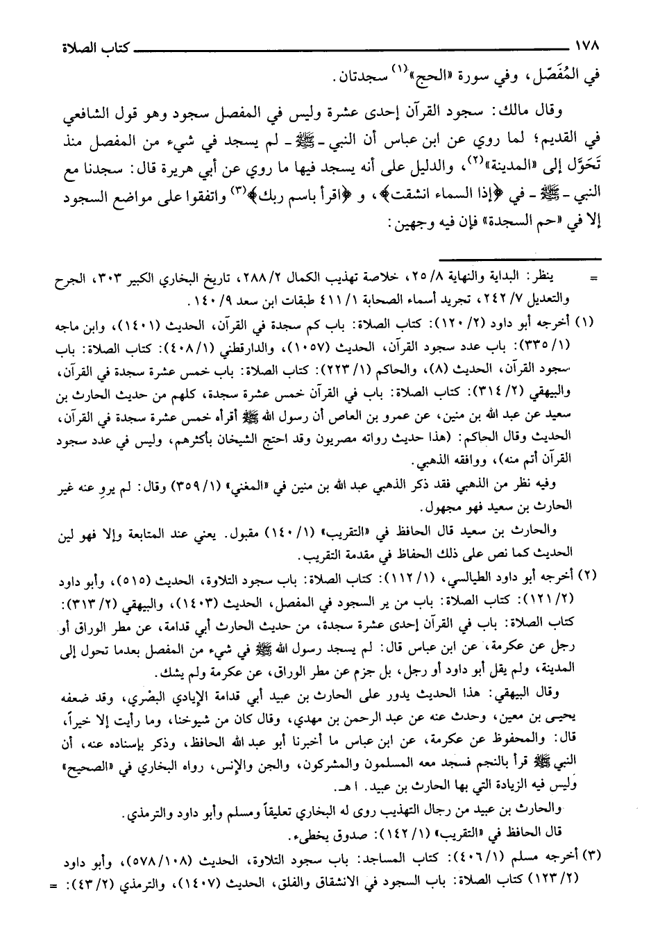 وقال مالك: سجود القرآن إحدى عشرة وليس في المفصل سجود وهو قول الشافعي في القديم؛ لما روي عن ابن عباس أن النبي- صلى الله عليه وسلم- لم يسجد في شيء من المفصل منذ تحوَّل إلى "المدينة"، والدليل على أنه يسجد فيها ما روي عن أبي هريرة قال: سجدنا مع النبي- صلى الله عليه وسلم- في {إِذَا السَّمَاءُ انشَقَّتْ}، و {اقْرَا بِاسْمِ رَبِّكَ} واتفقوا على مواضع السجود إلا في "حم السجدة" فإن فيه وجهين:
