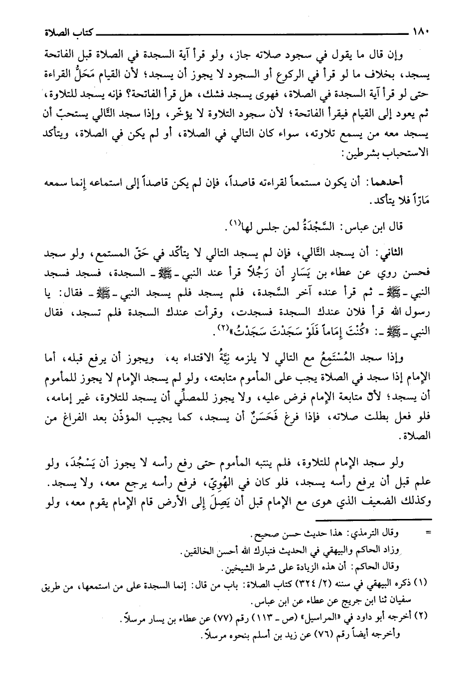 وإذا سجد المستمع مع التالي لا يلزمه نيَّة الاقتداء به، ويجوز أن يرفع قبله، أما الإمام إذا سجد في الصلاة يجب على المأموم متابعته، ولو لم يسجد الإمام لا يجوز للمأموم أن يسجد؛ لأن متابعة الإمام فرض عليه، ولا يجوز للمصلِّي أن يسجد للتلاوة، غير إمامه، فلو فعل بطلت صلاته، فإذا فرغ فحسنٌ أن يسجد، كما يجيب المؤذّن بعد الفراغ من الصلاة.
