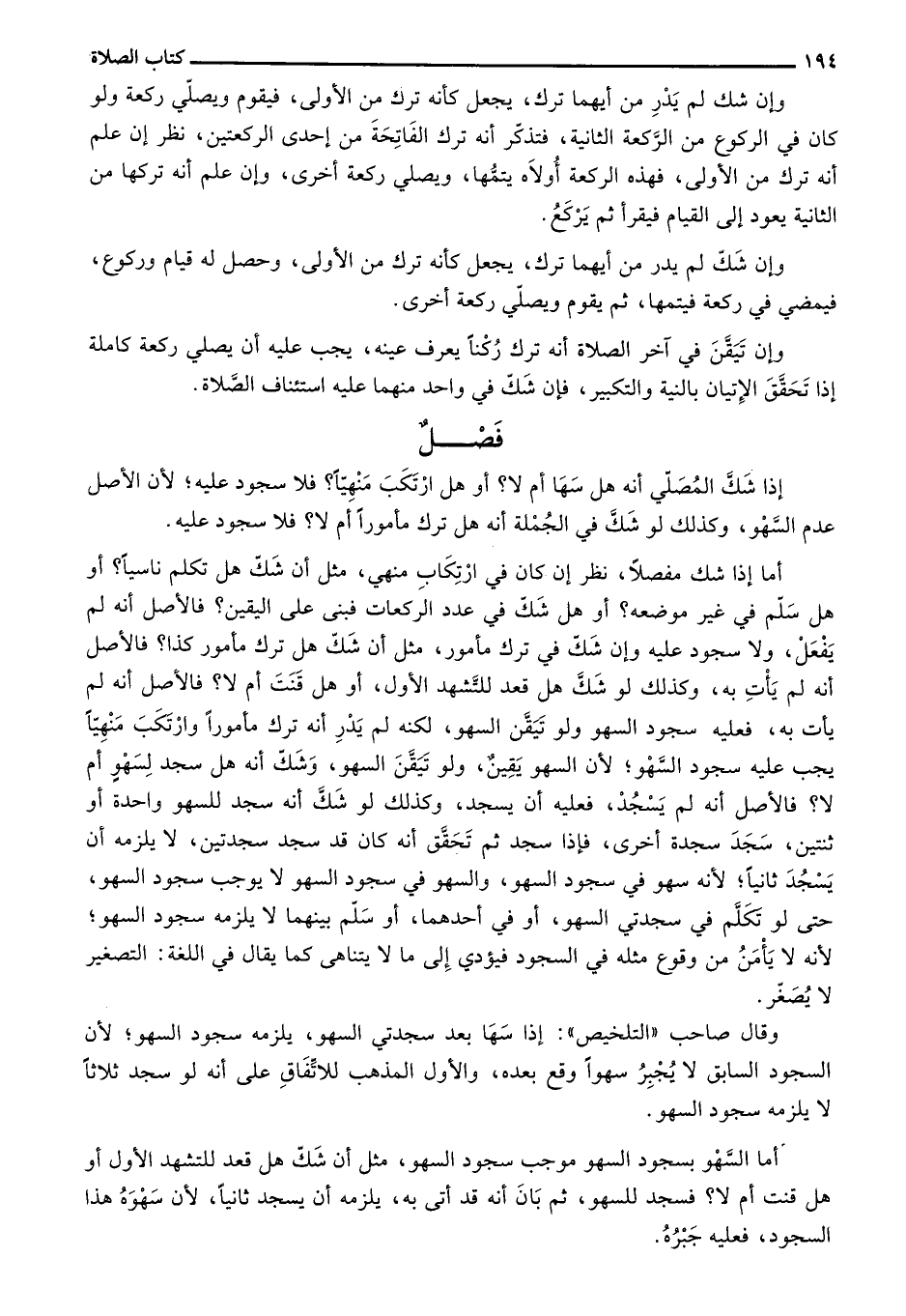 أما إذا شك مفصلاً، نظر إن كان في ارتكاب منهي، مثل أن شك هل تكلم ناسياً؟ أو هل سلم في غير موضعه؟ أو هل شك في عدد الركعات فبنى على اليقين؟ فالأصل أنه لم يفعل، ولا سجود عليه وإن شك في ترك مأمور، مثل أن شك هل ترك مأمور كذا؟ فالأصل أنه لم يأت به، وكذلك لو شك هل قعد للتشهد الأول، أو هل قنت أم لا؟ فالأصل أنه لم يأت به، فعليه سجود السهو ولو تيقن السهو، لكنه لم يدرِ أنه ترك مأموراً وارتكب منهياً يجب عليه سجود السهو؛ لأن السهو يقينٌ، ولو تيقَّن السهو، وشكّ أنه هل سجد لسهو أم لا؟ فالأصل أنه لم يسجد، فعليه أن يسجد، وكذلك لو شك أنه سجد للسهو واحدة أو ثنتين، سجد سجدة أخرى، فإذا سجد ثم تحقق أنه كان قد سجد سجدتين، لا يلزمه أن يسجد ثانياً؛ لأنه سهو في سجود السهو، والسهو في سجود السهو لا يوجب سجود السهو، حتى لو تكلم في سجدتي السهو، أو في أحدهما، أو سلّم بينهما لا يلزمه سجود السهو؛ لأنه لا يمن من وقوع مثله في السجود فيؤدي إلى ما لا يتناهى كما يقال في اللغة: التصغير لا يُصغّر.